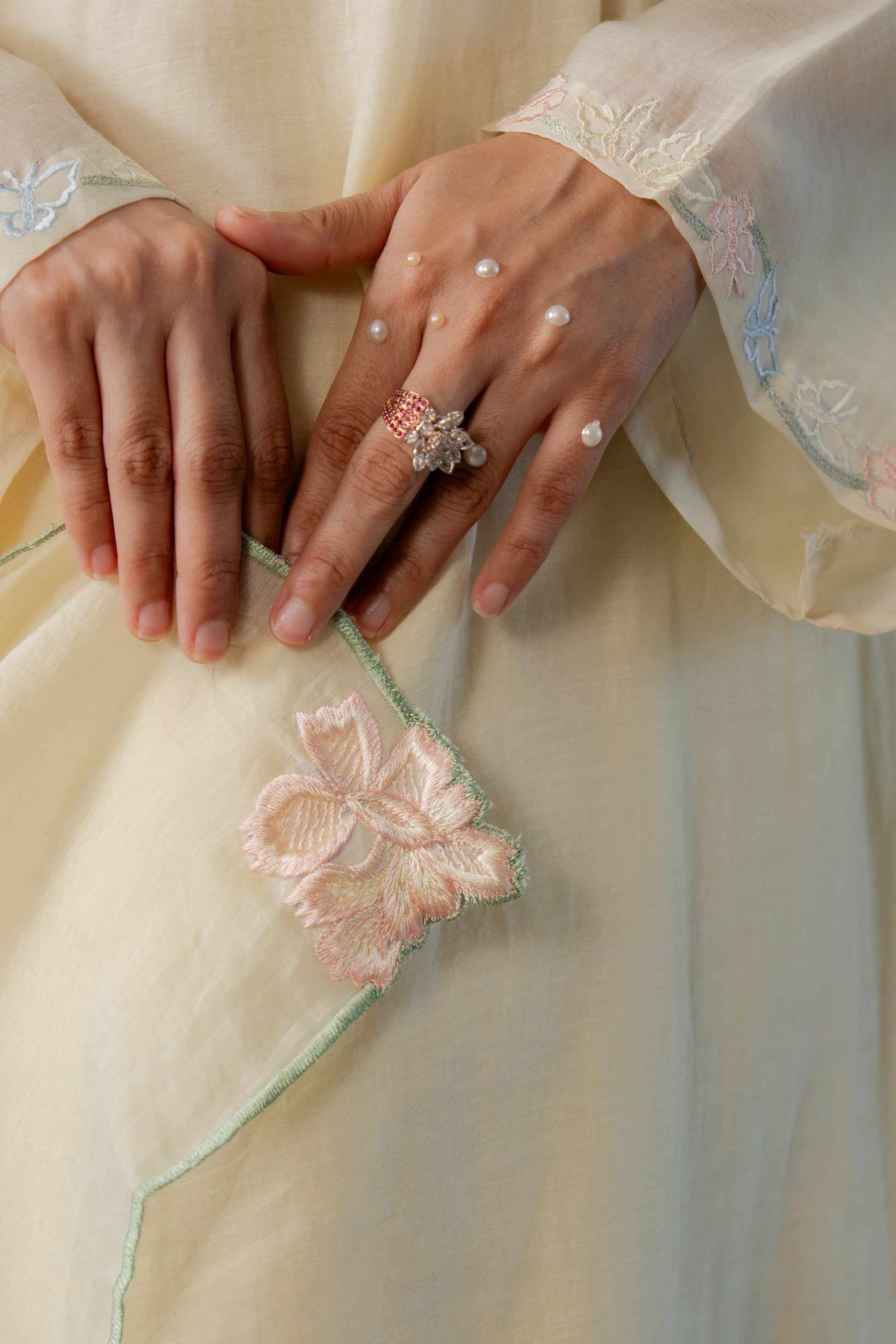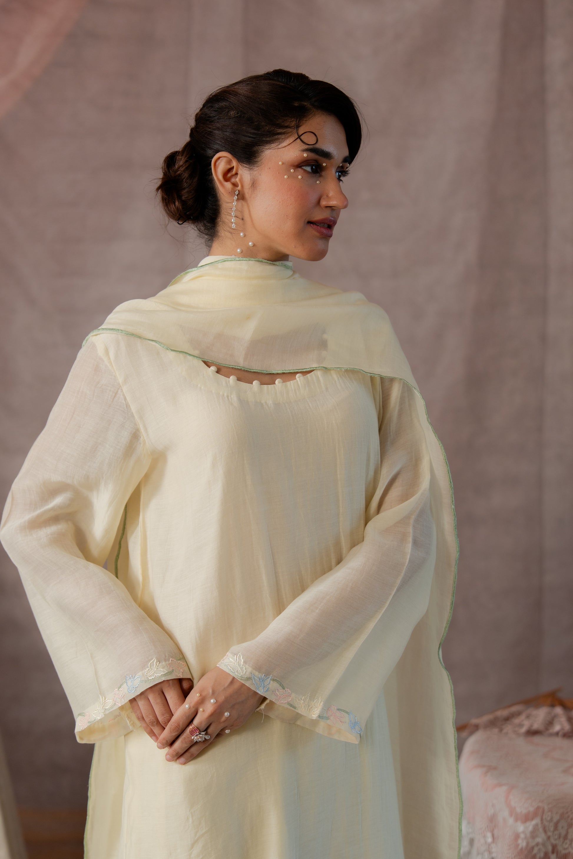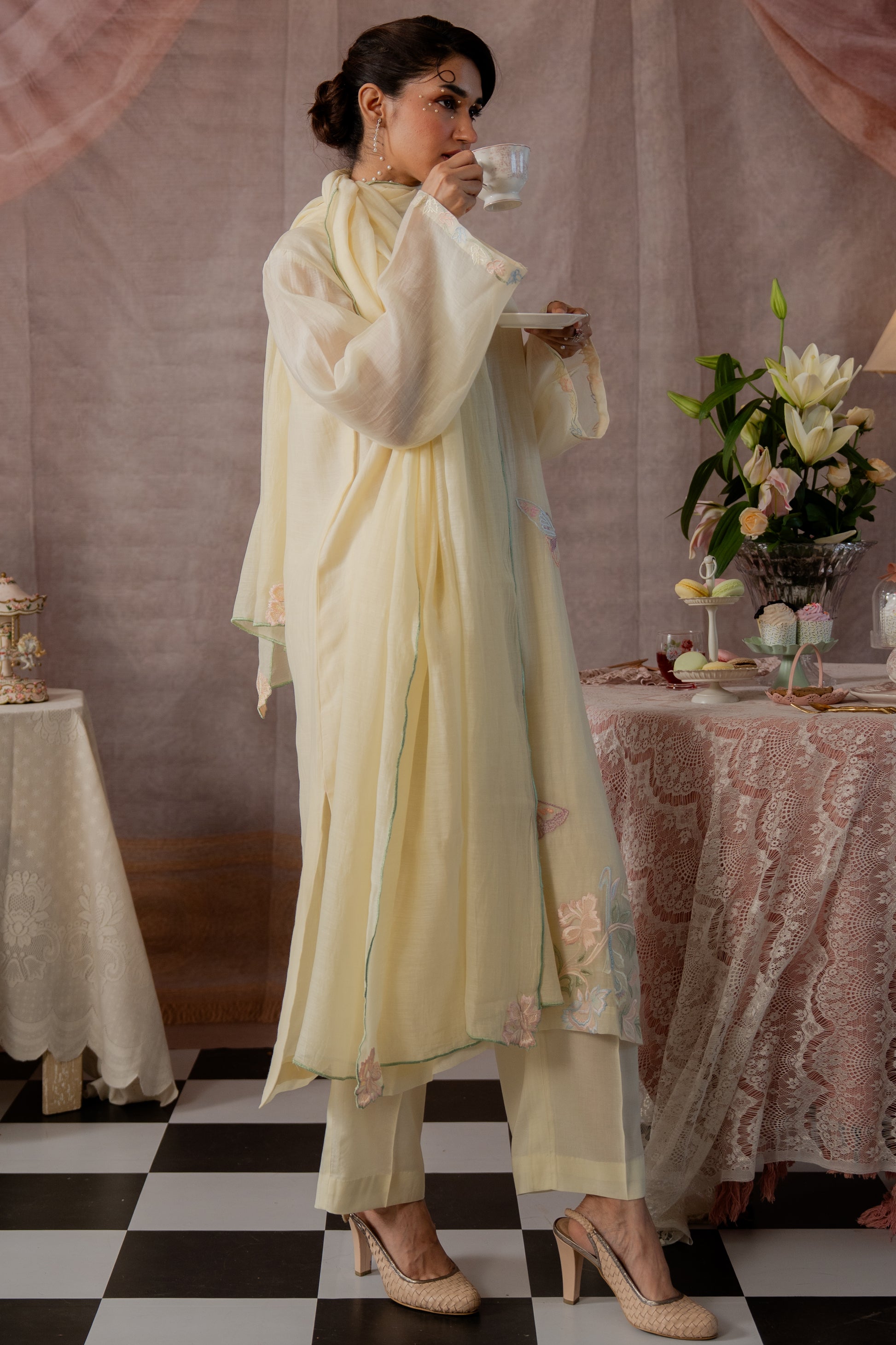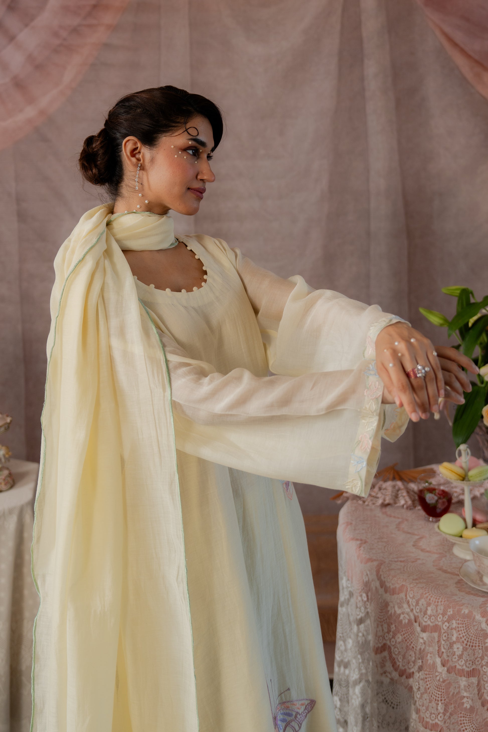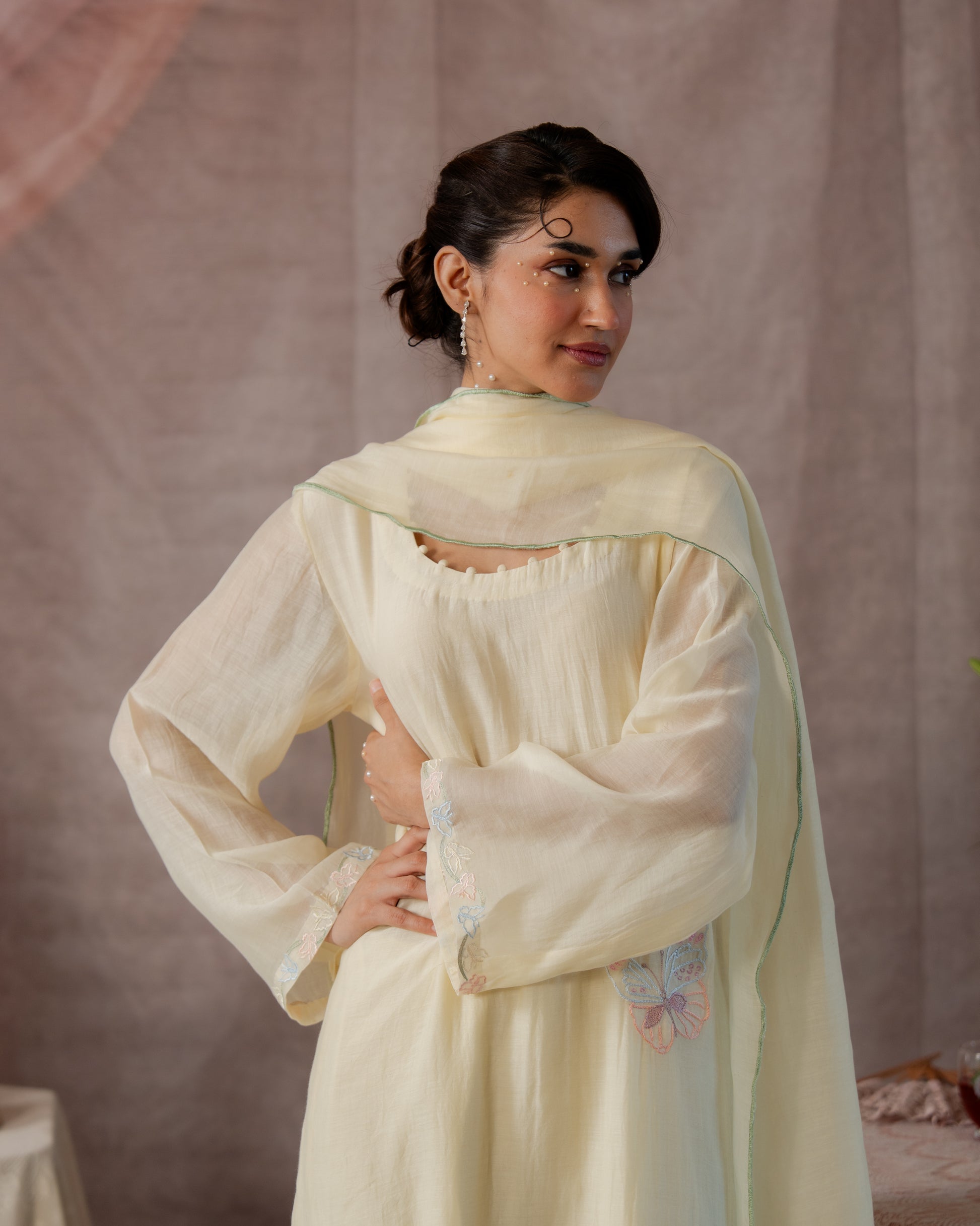 Description: A soft yellow kurta set featuring delicate butterfly and floral embroidery. Light, airy, and perfect for effortless day elegance with a touch of whimsy.