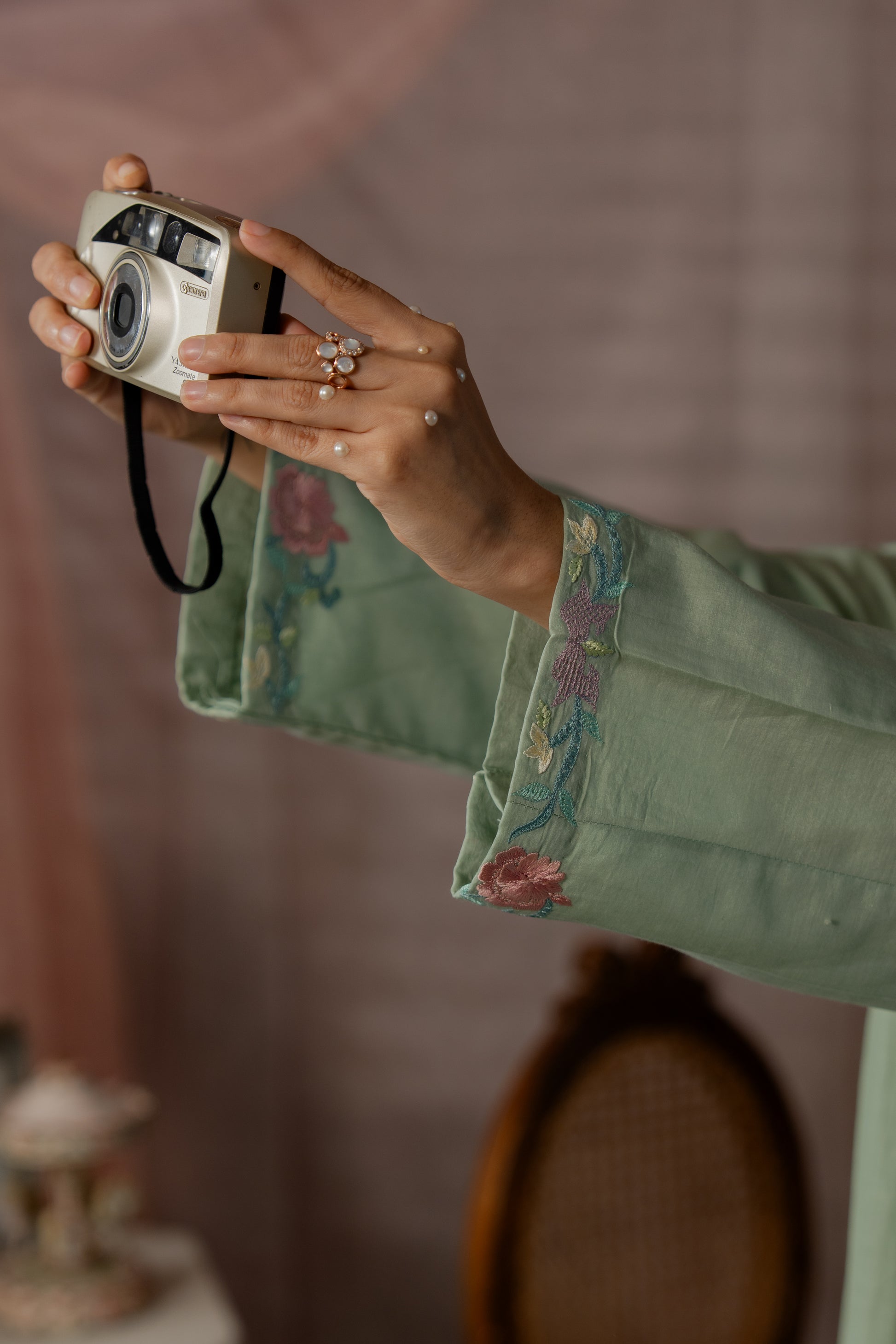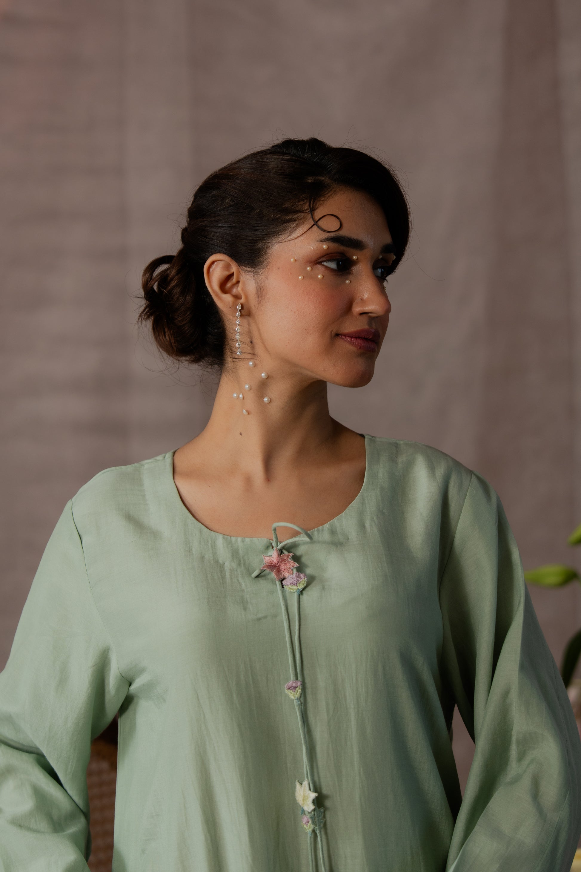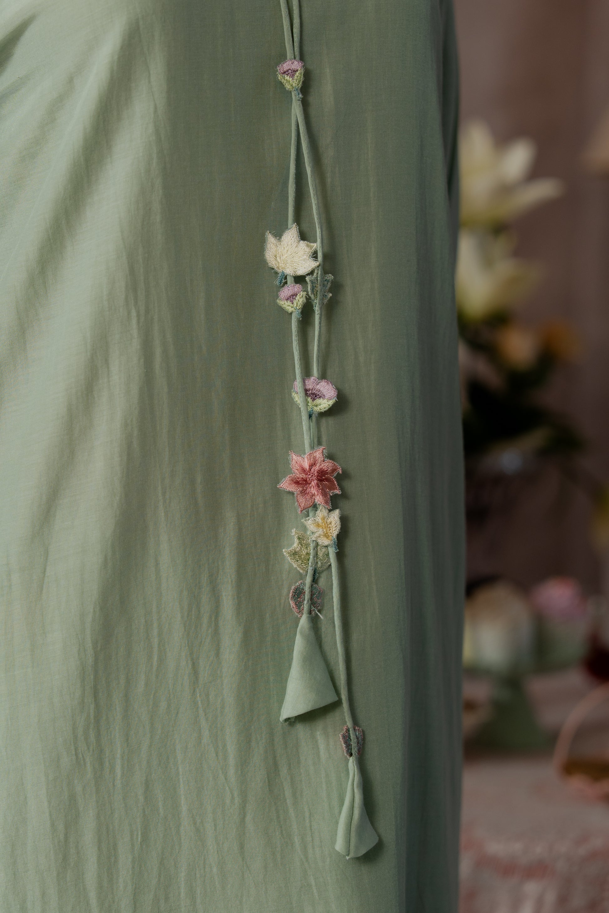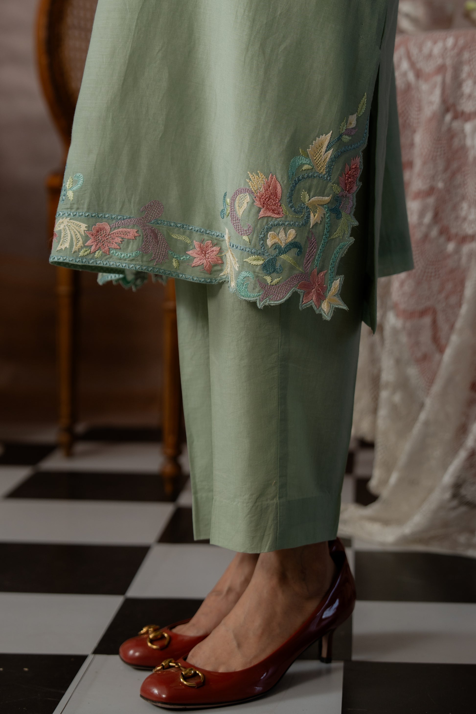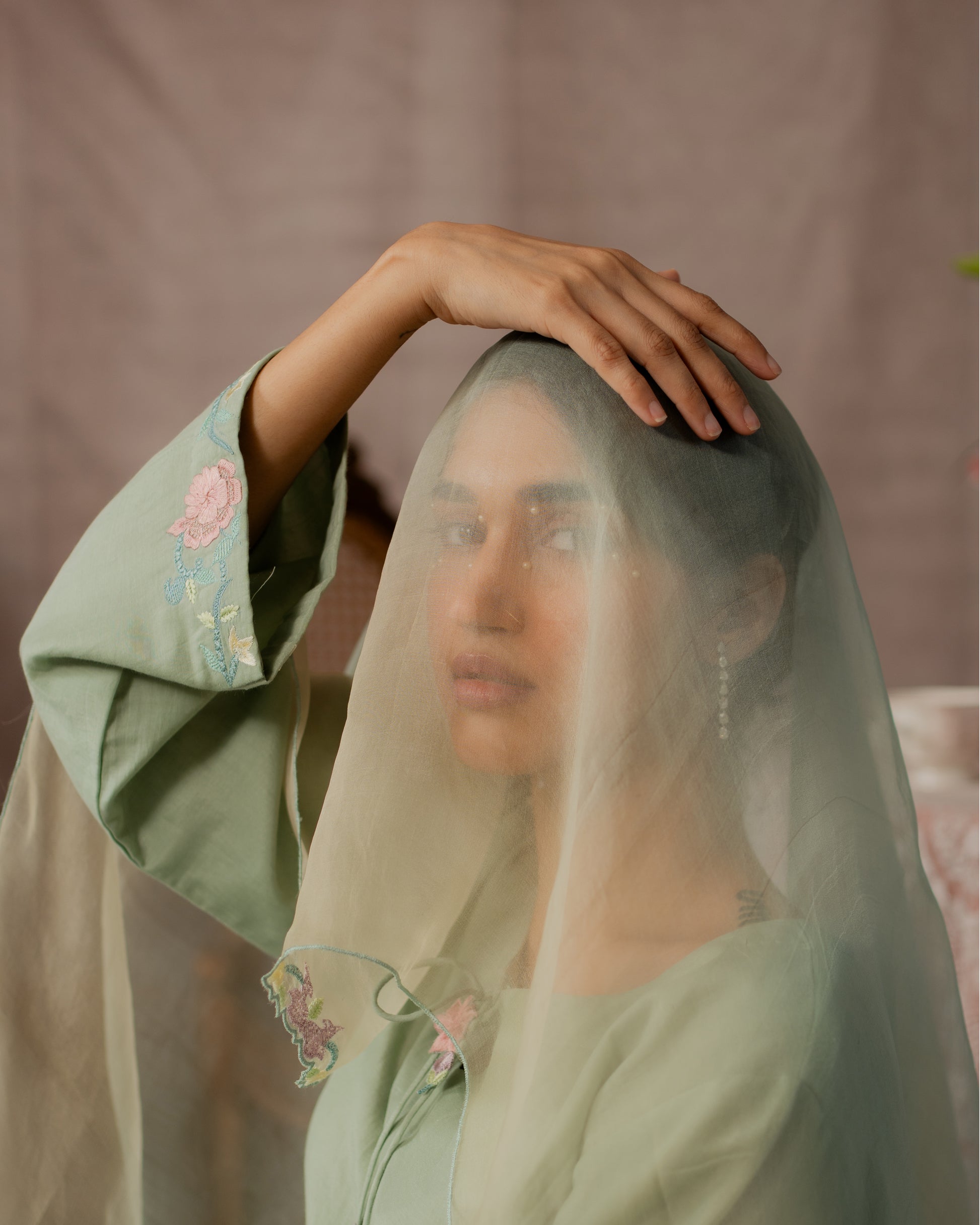Description: A luxe sage-hued kurta set crafted in premium fabric, featuring intricate cutwork at the ghera and a neckline adorned with delicate embroidered latkans. The sleeves are finished with a finely embroidered border for added elegance. Optional: pair it with a tri-colour organza dupatta scattered with embroidered motifs along the long sides and finished with embroidery on all four corners — a graceful, statement-making ensemble.
