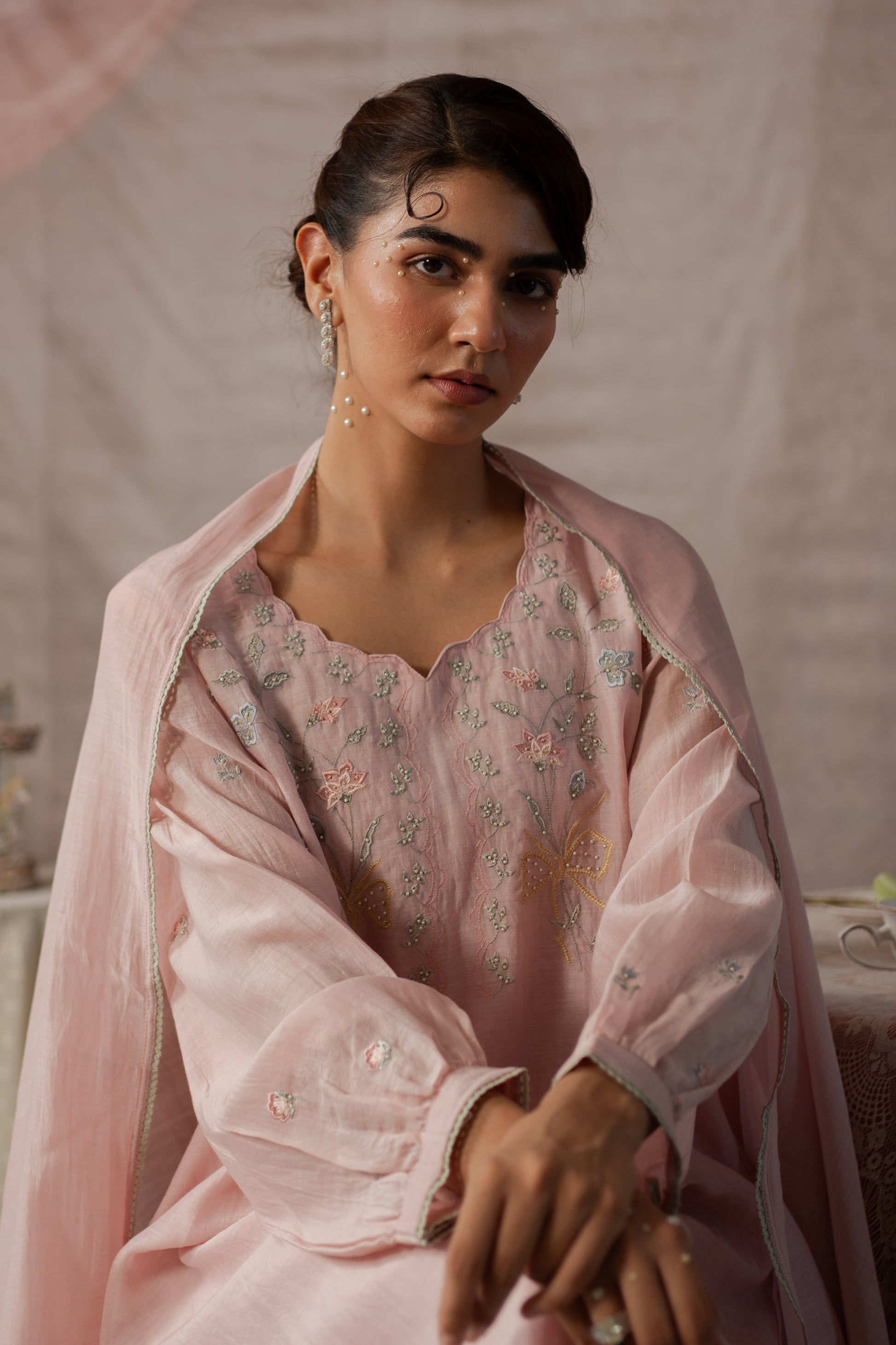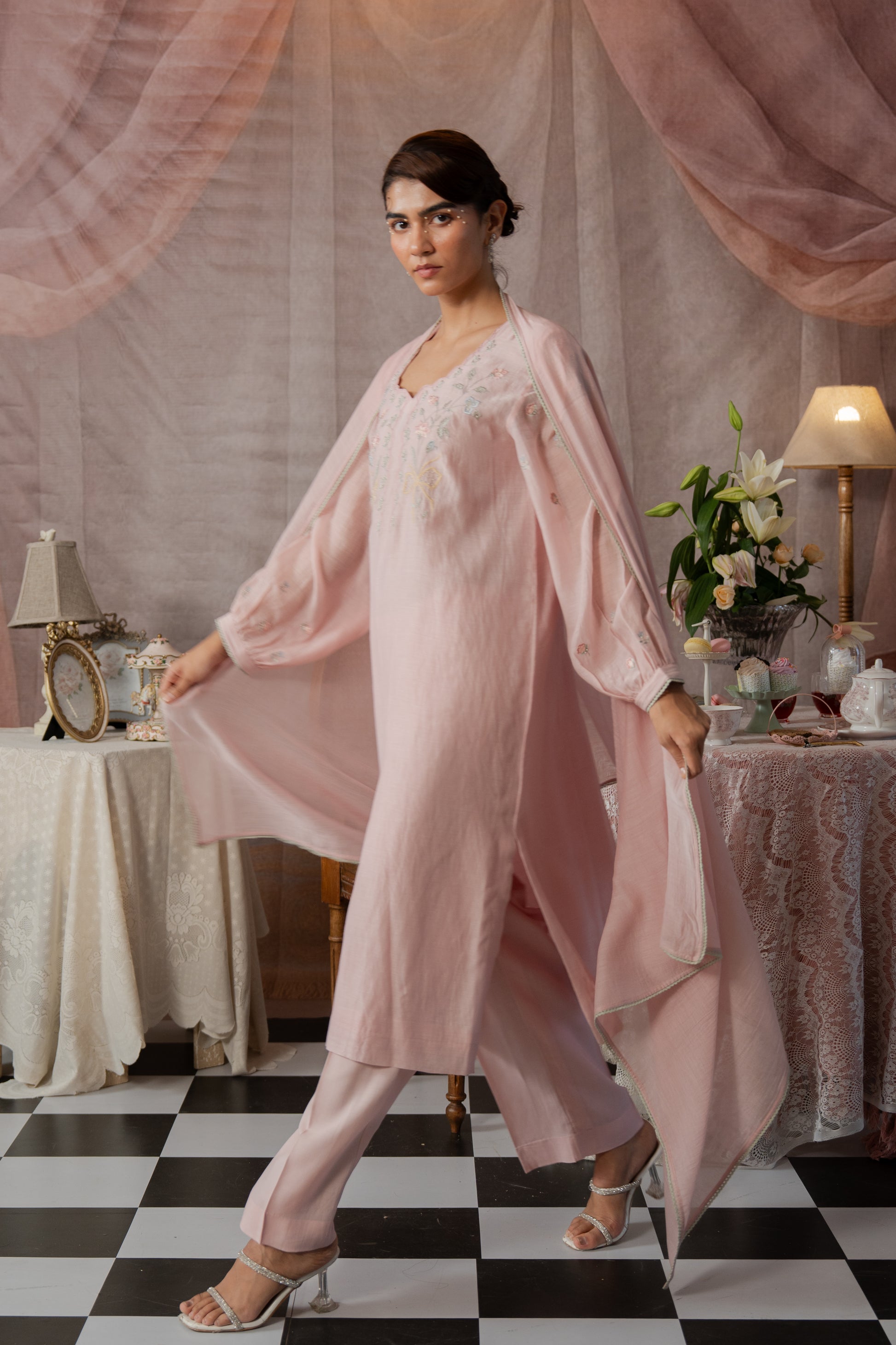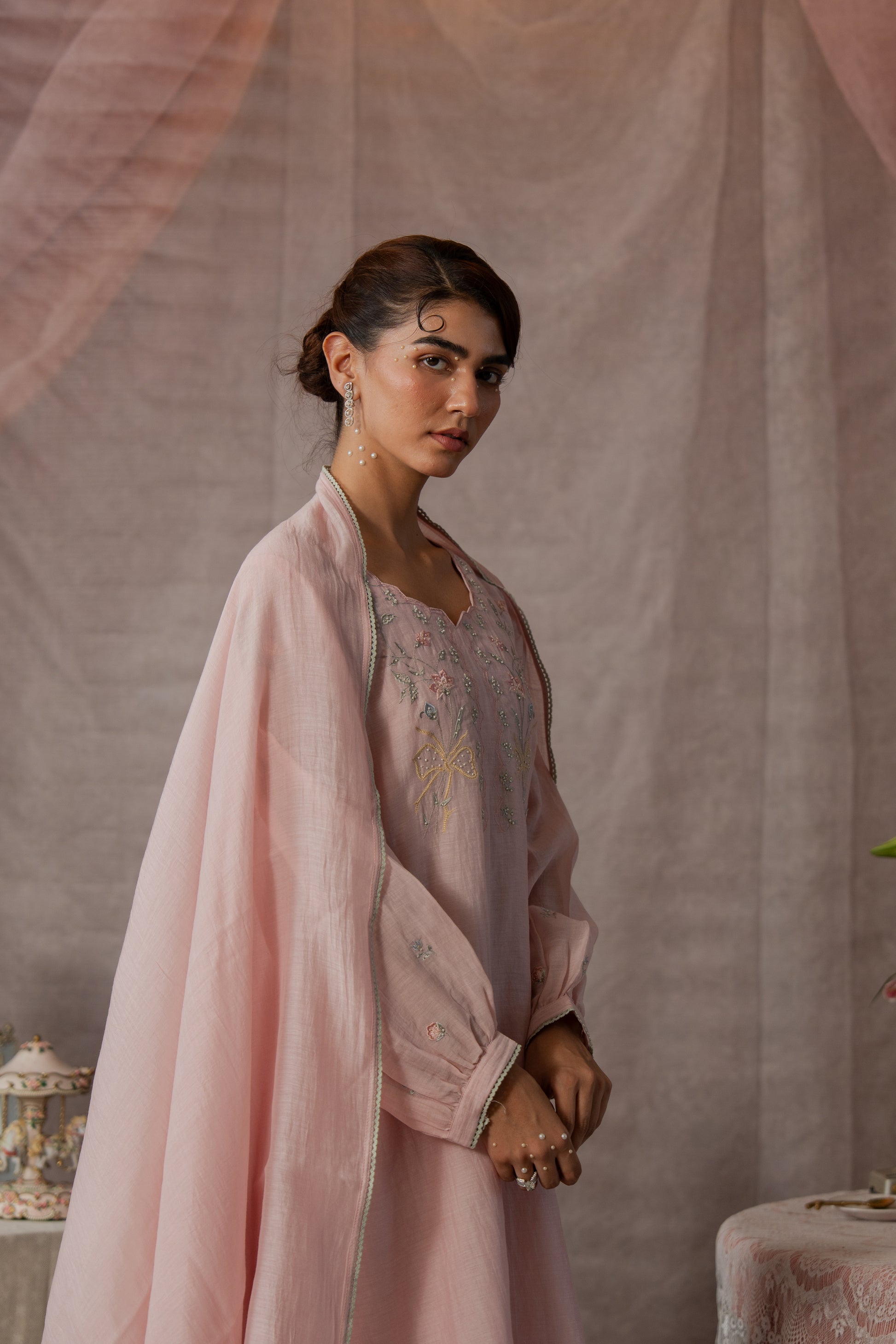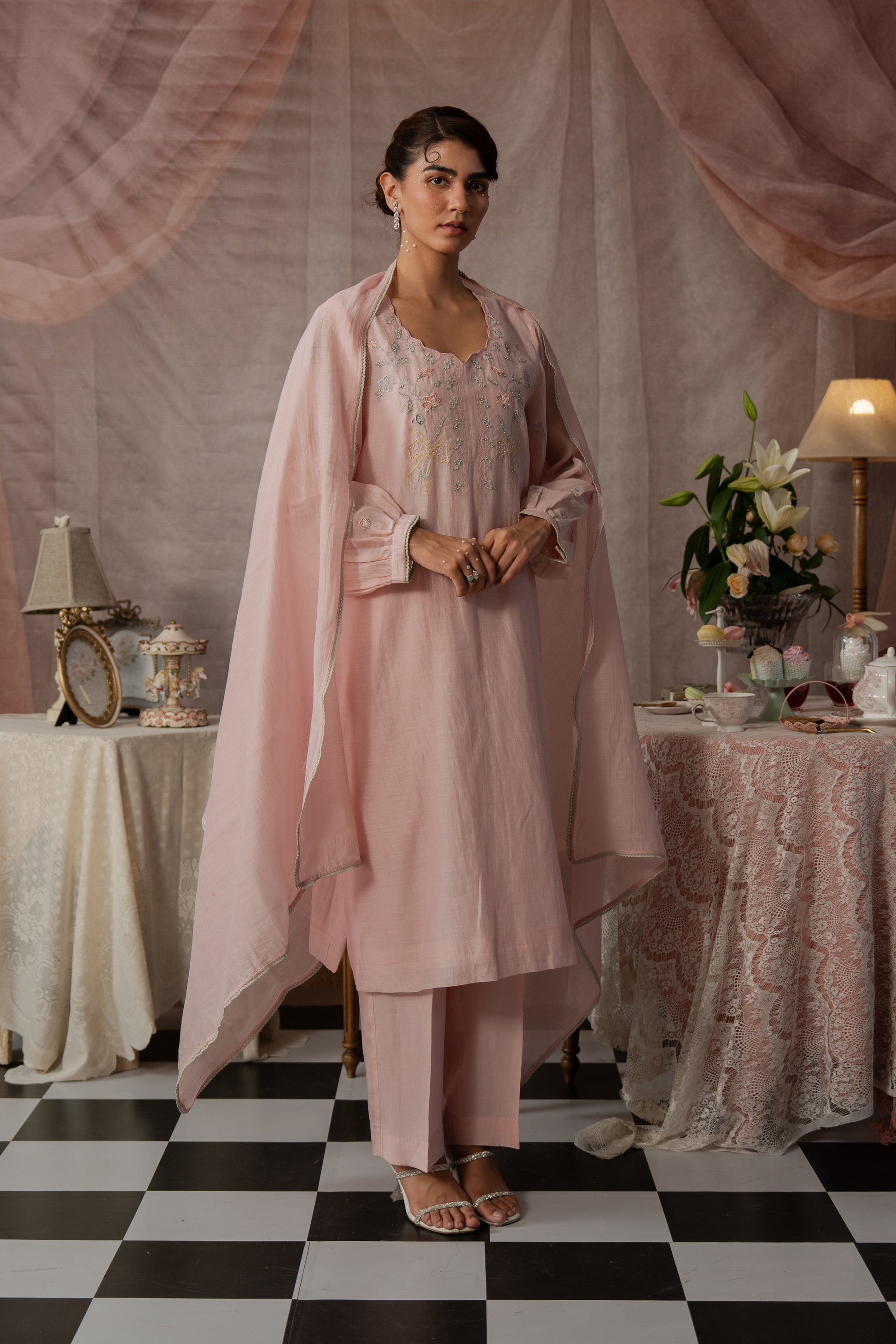 Description: A delicate kurta set featuring fine embroidery on the neckline and sleeves, with a soft scalloped neck and cuffed sleeves finished with lace detailing. Optional: pair it with a Chanderi dupatta edged with lace for a graceful, polished look.