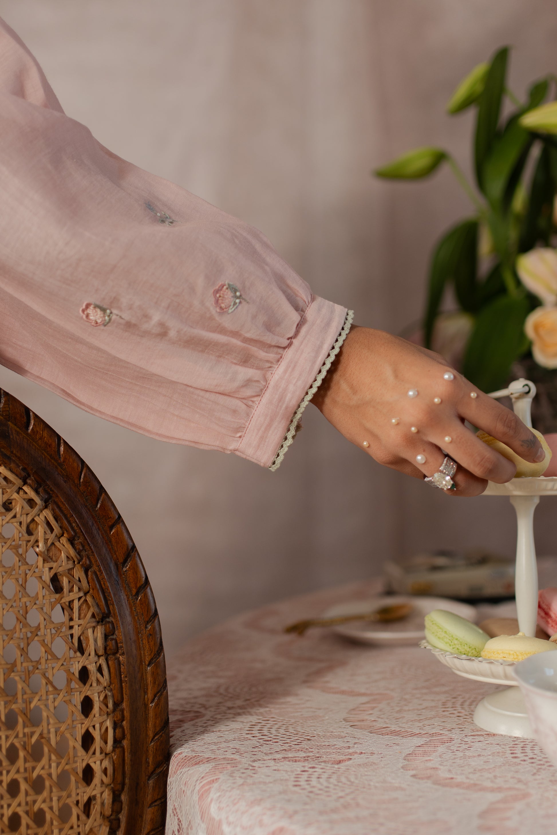 Sleeves: Full-length sleeves featuring embroidered booties and finished with lace at the edge