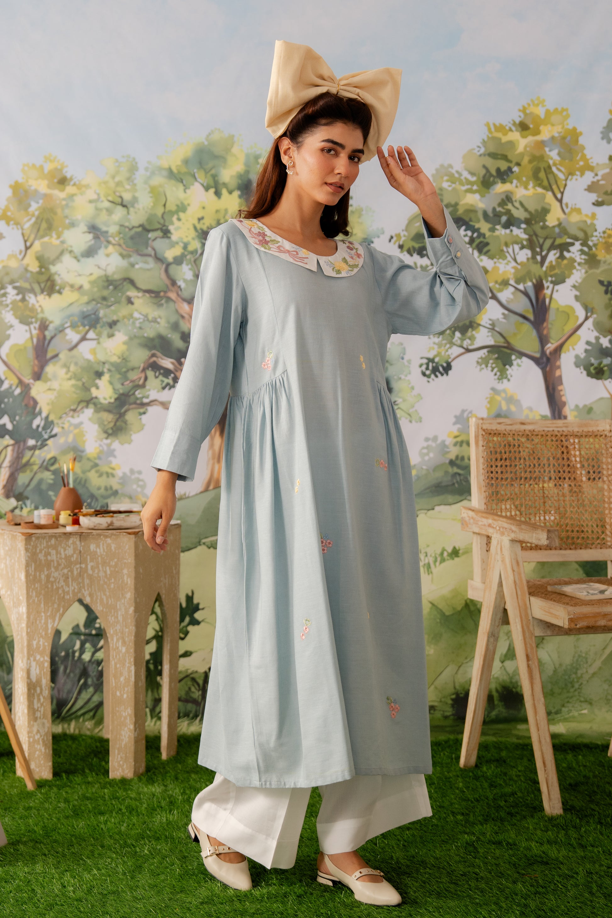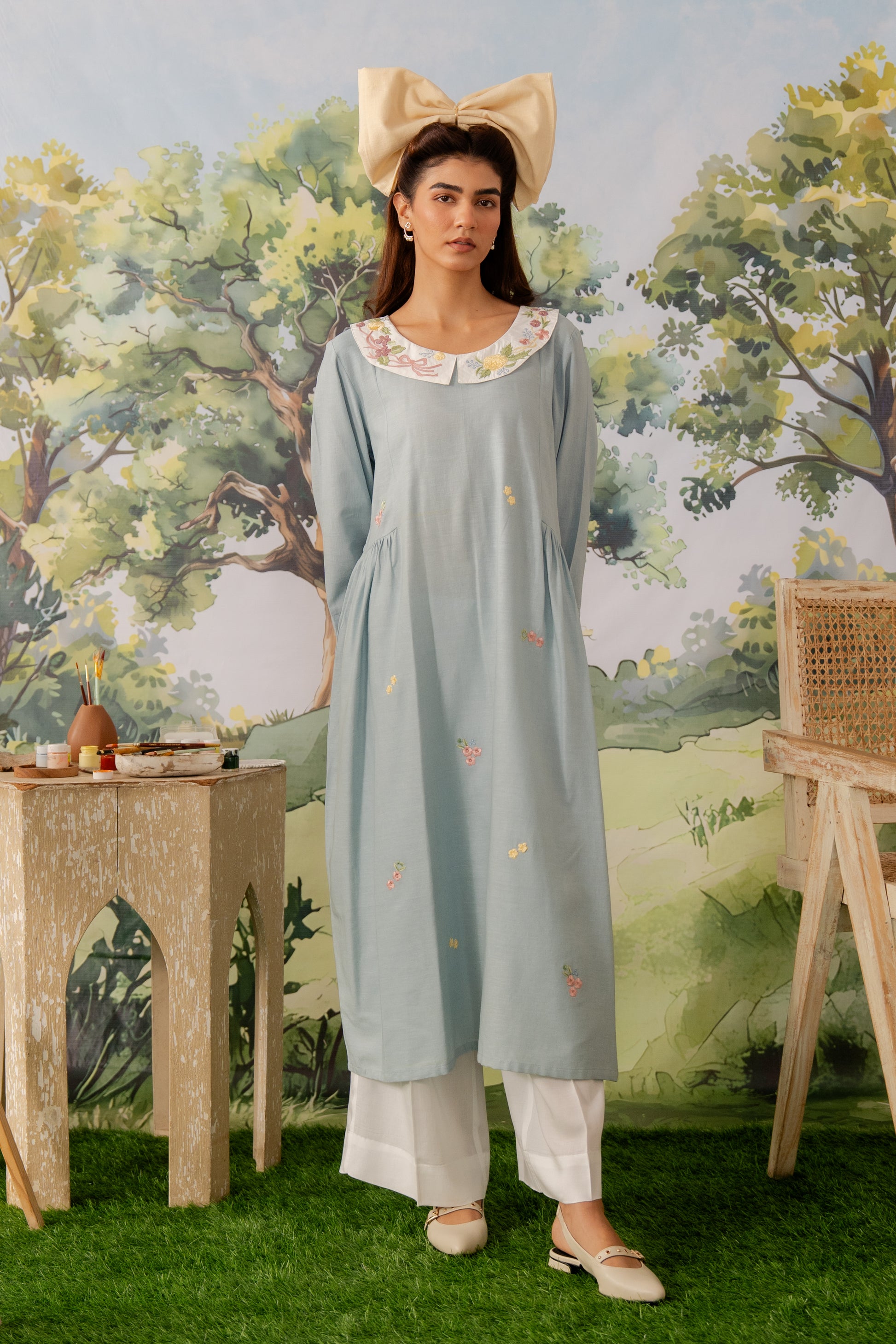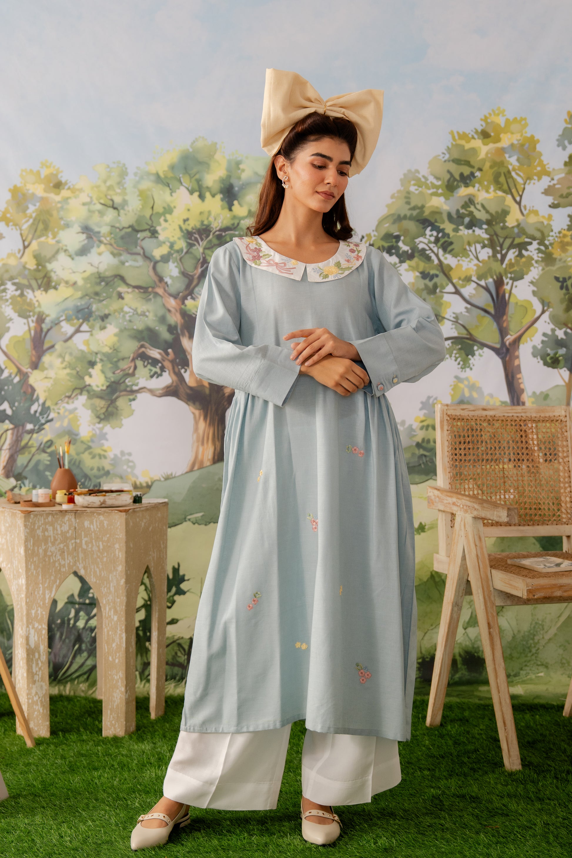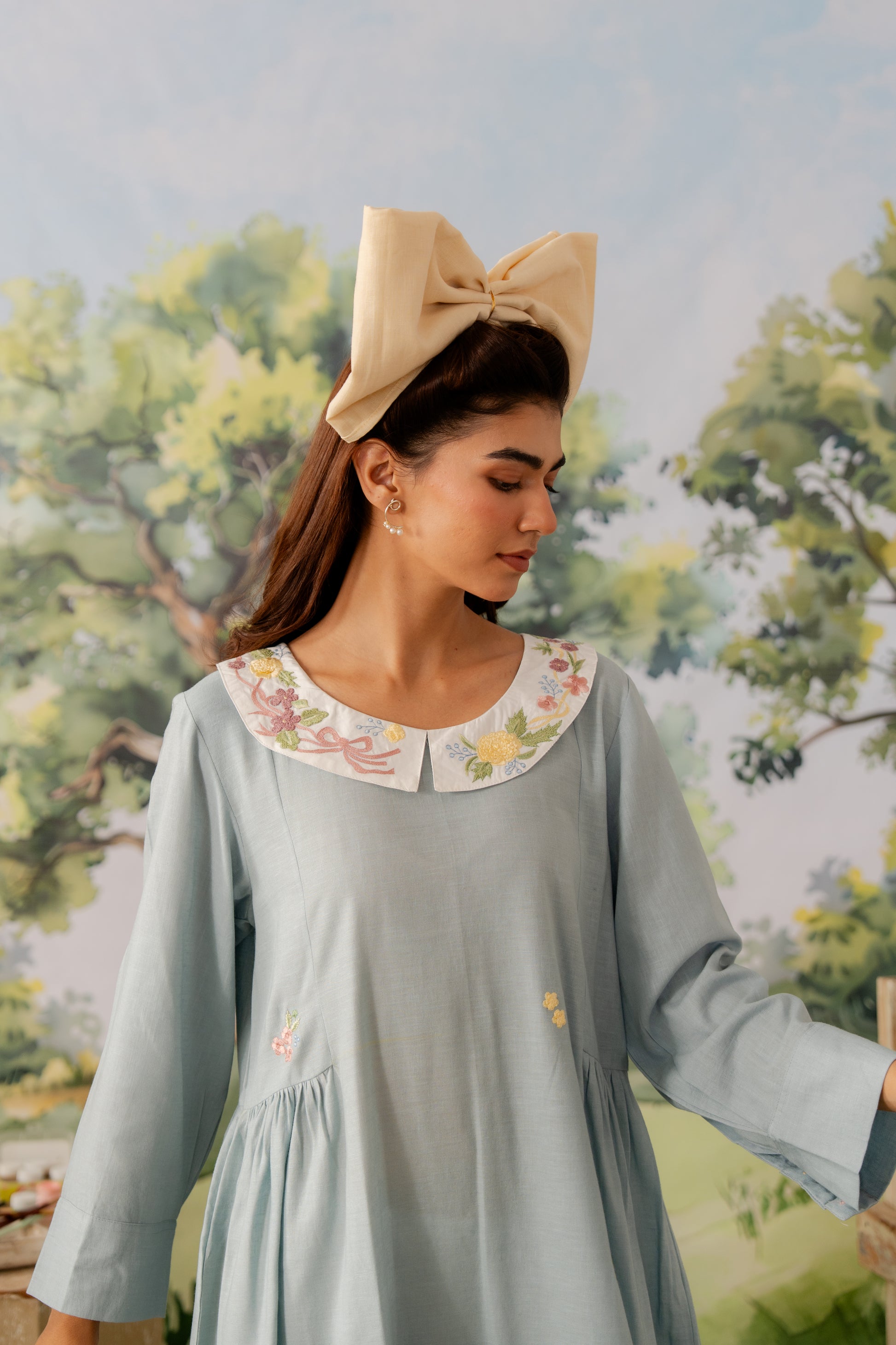 Neckline: Peter Pan collar with beautiful floral embroidery