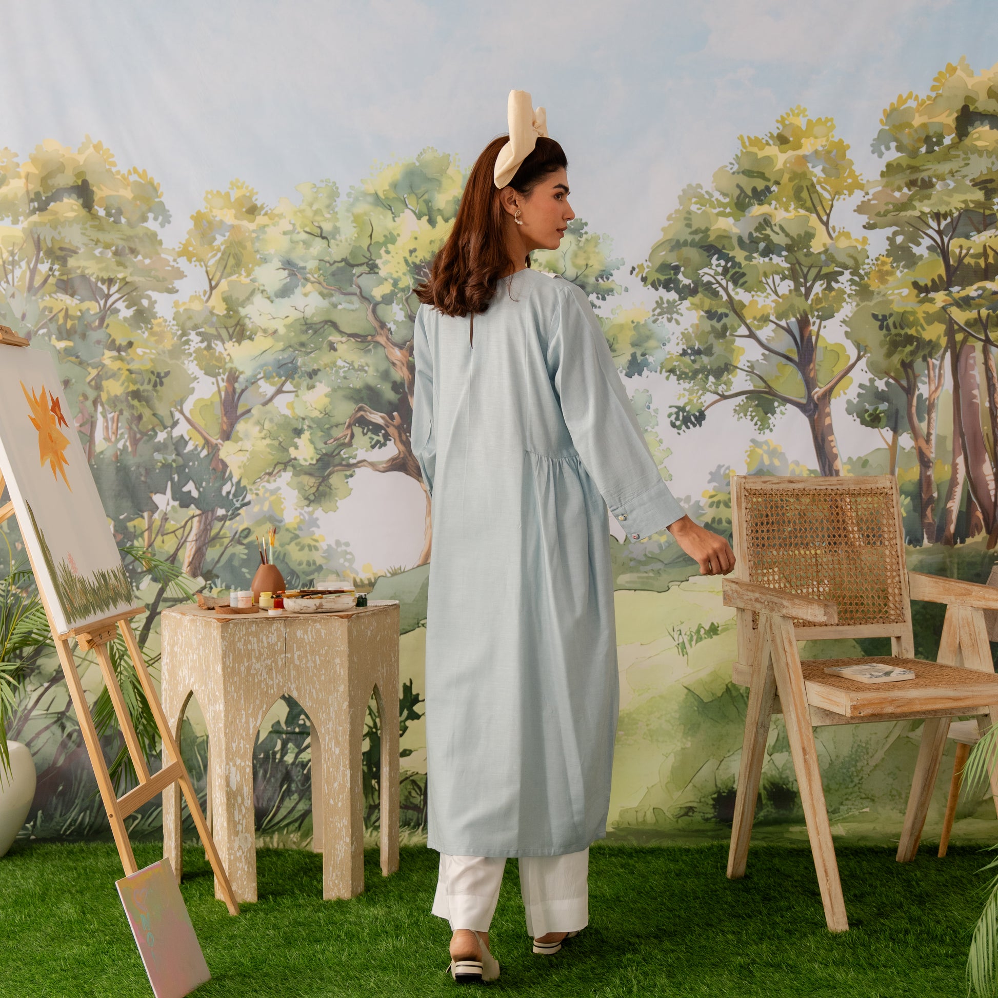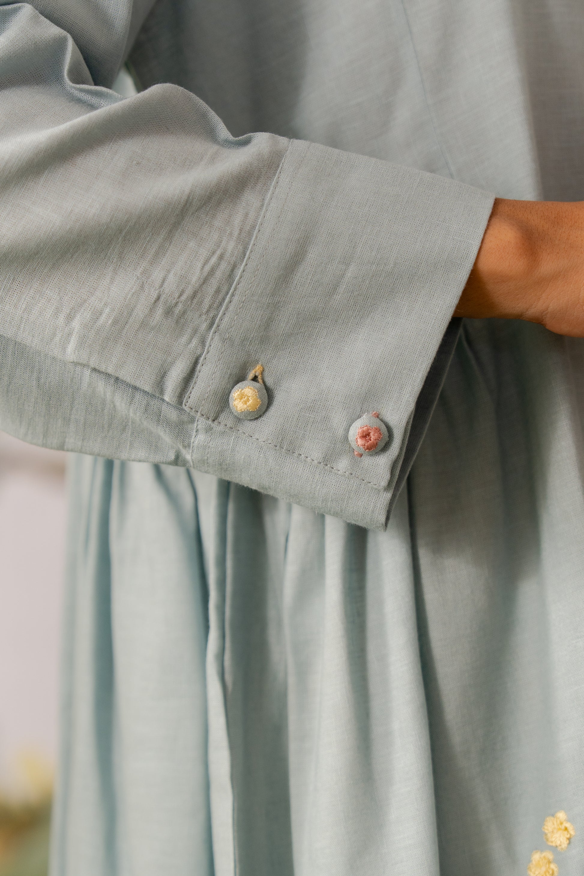 Sleeves: Full-length straight sleeves finished with embroidered button details on the cuff