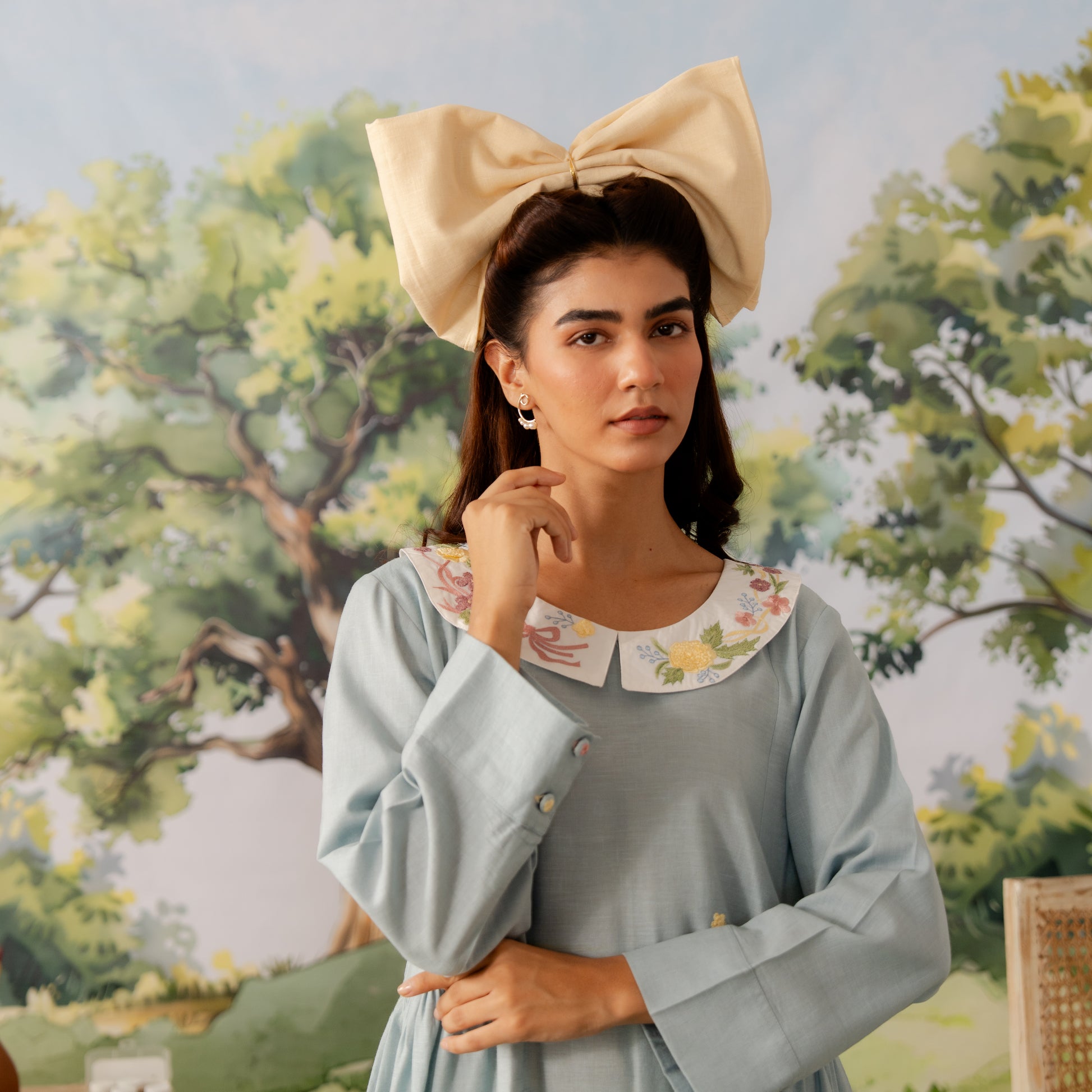 Description: A charming linen ensemble featuring a Peter Pan collar adorned with delicate floral embroidery, adding a touch of vintage elegance. Scattered embroidered small booties enhance its playful appeal, while cuffed sleeves provide a refined finish. Versatile in design, this piece can be styled as a standalone dress or paired with pants for a coordinated look — perfect for effortless day-to-evening transitions.