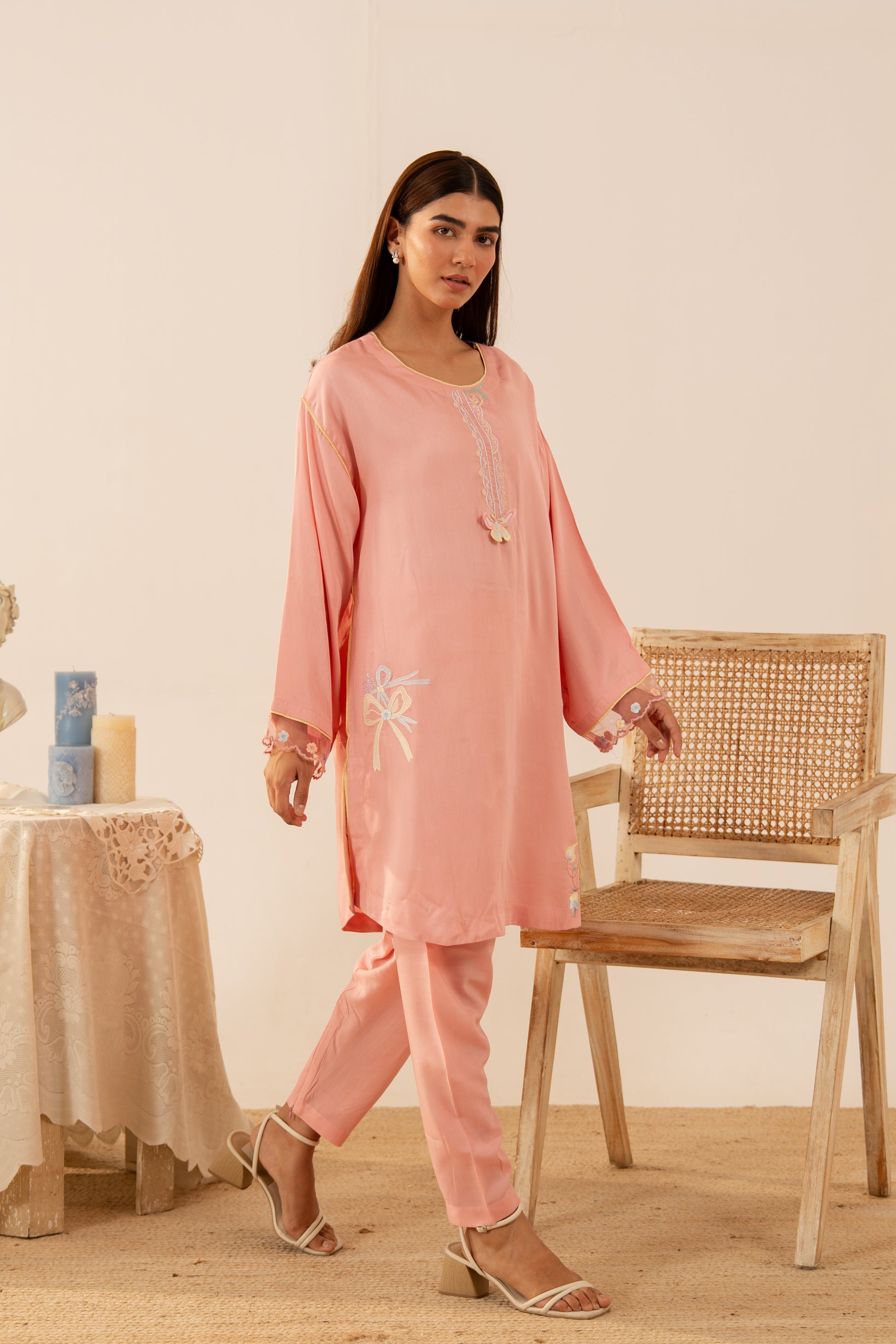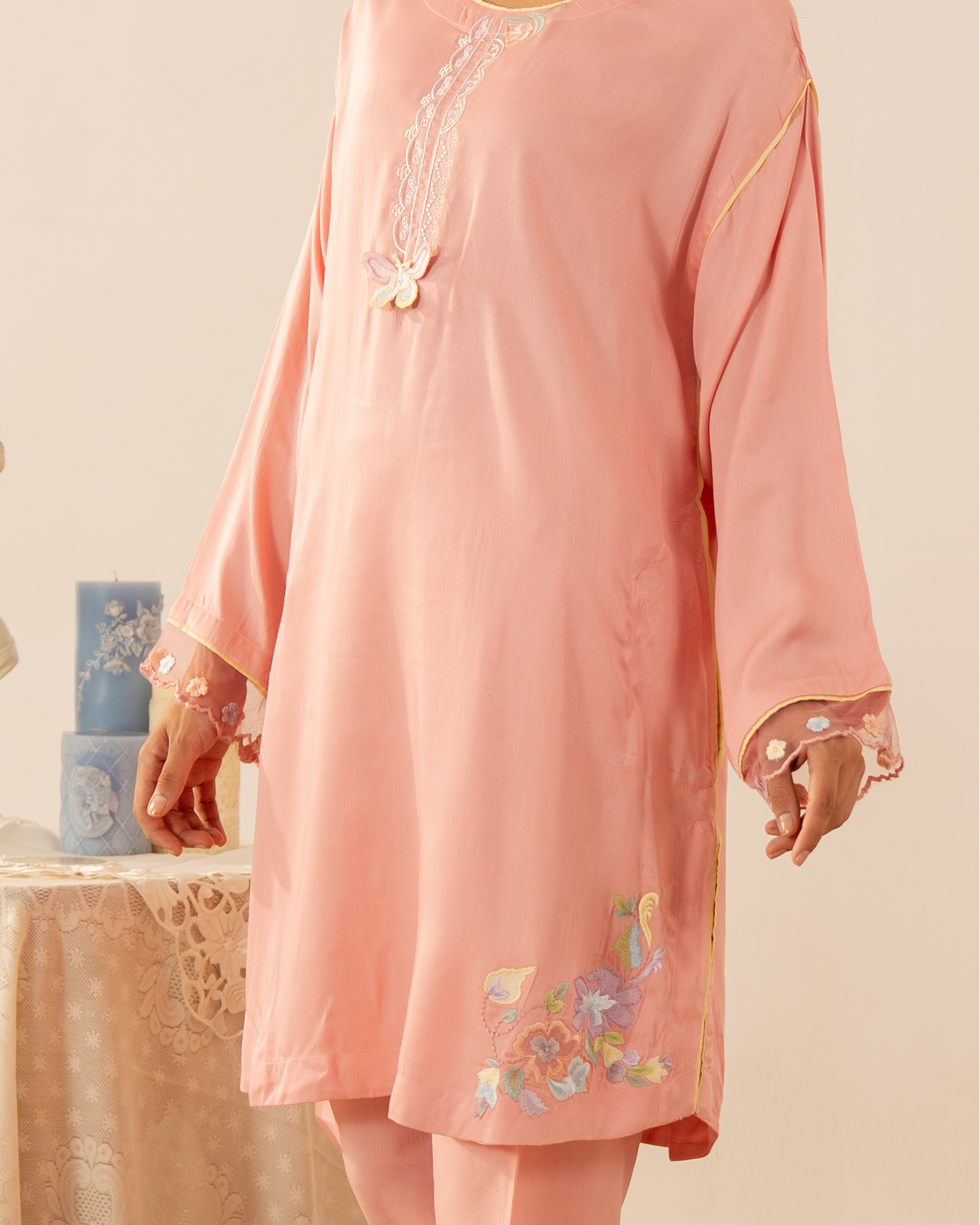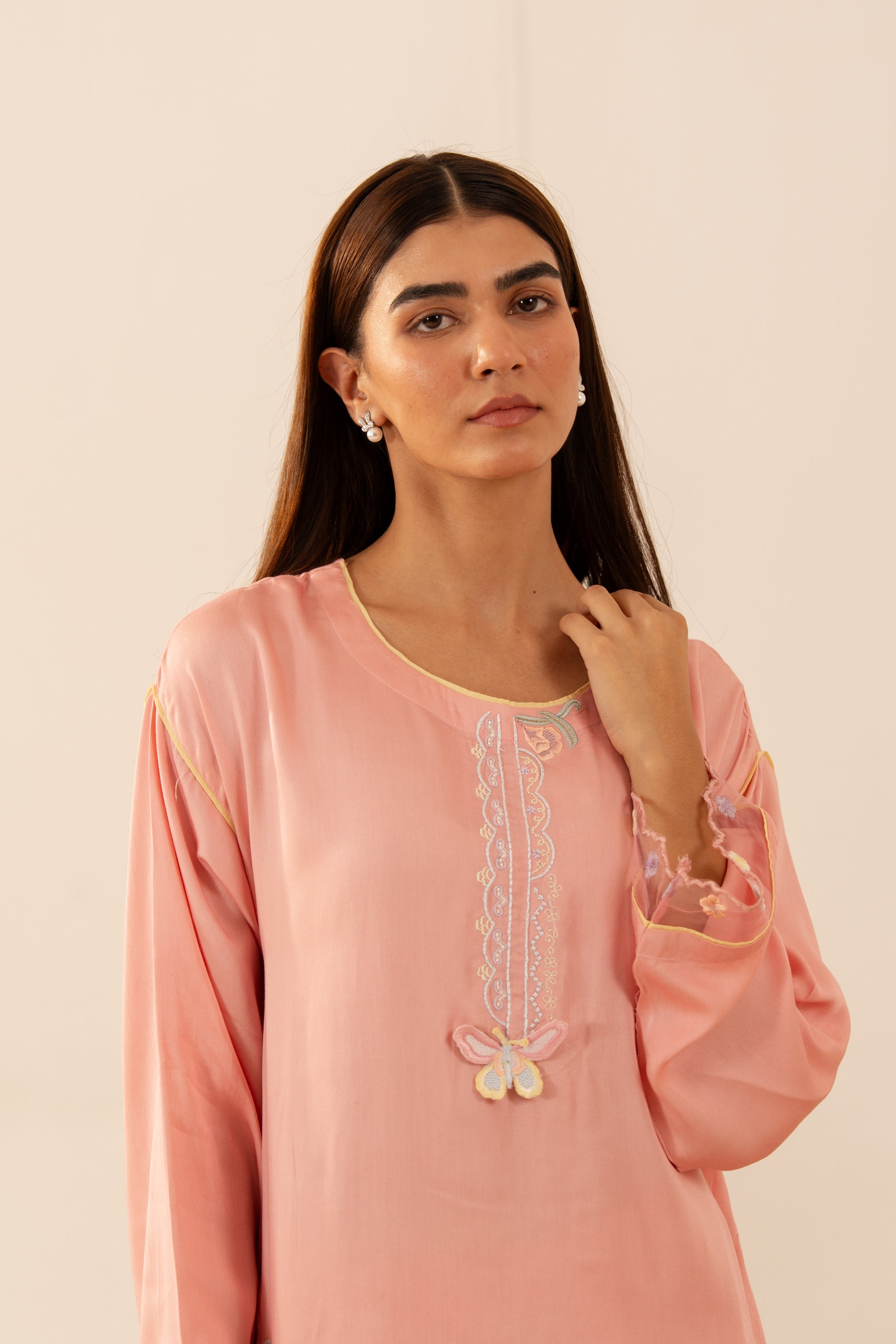 Description: A playful yet elegant bubblegum pink outfit in soft cotton satin, featuring chic vintage-inspired embroidery motifs and a delicately embroidered 3D butterfly on the neck. The loose-fit silhouette is elevated with yellow contrast piping on the sides—perfectly tailored for a summer tea party look.
