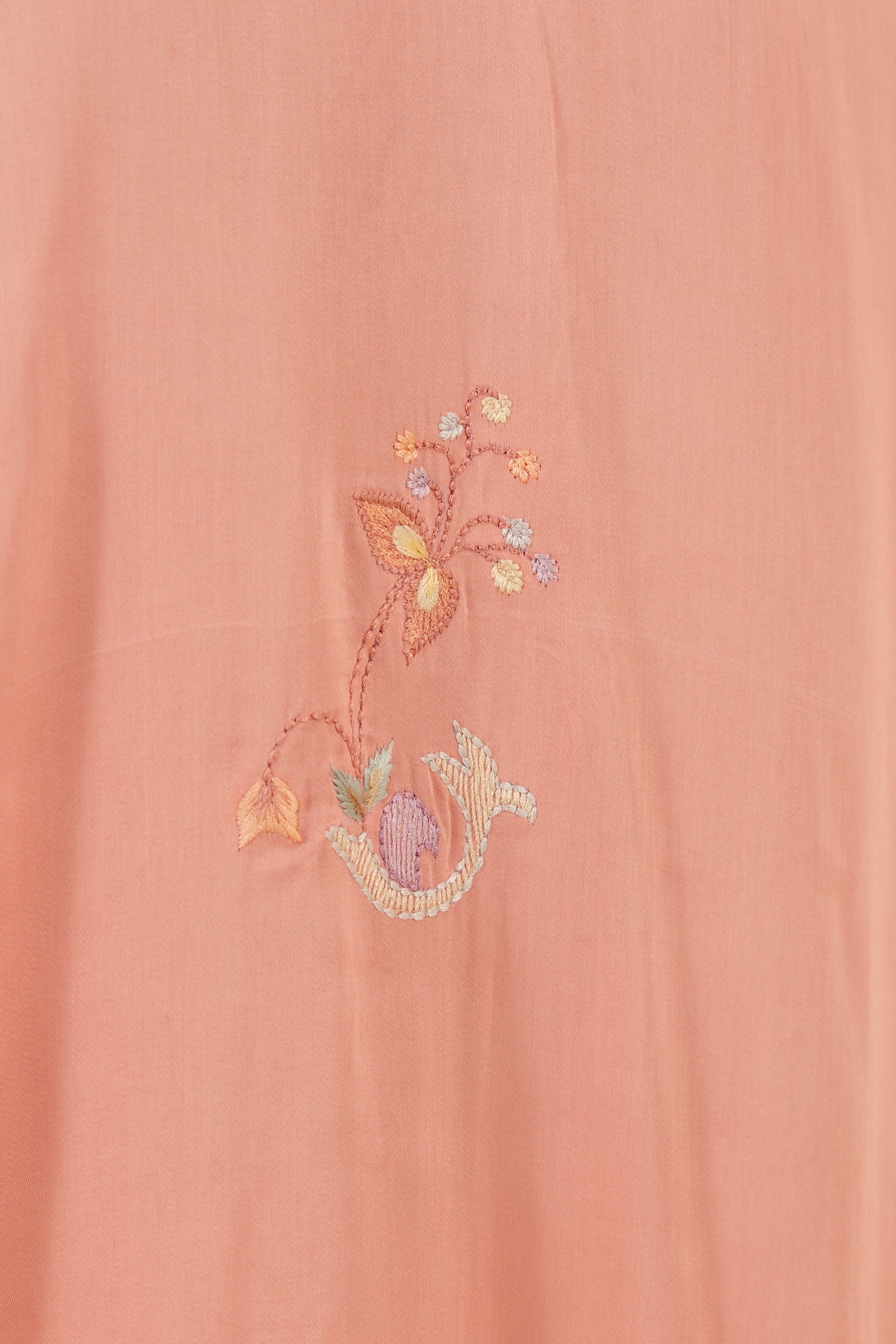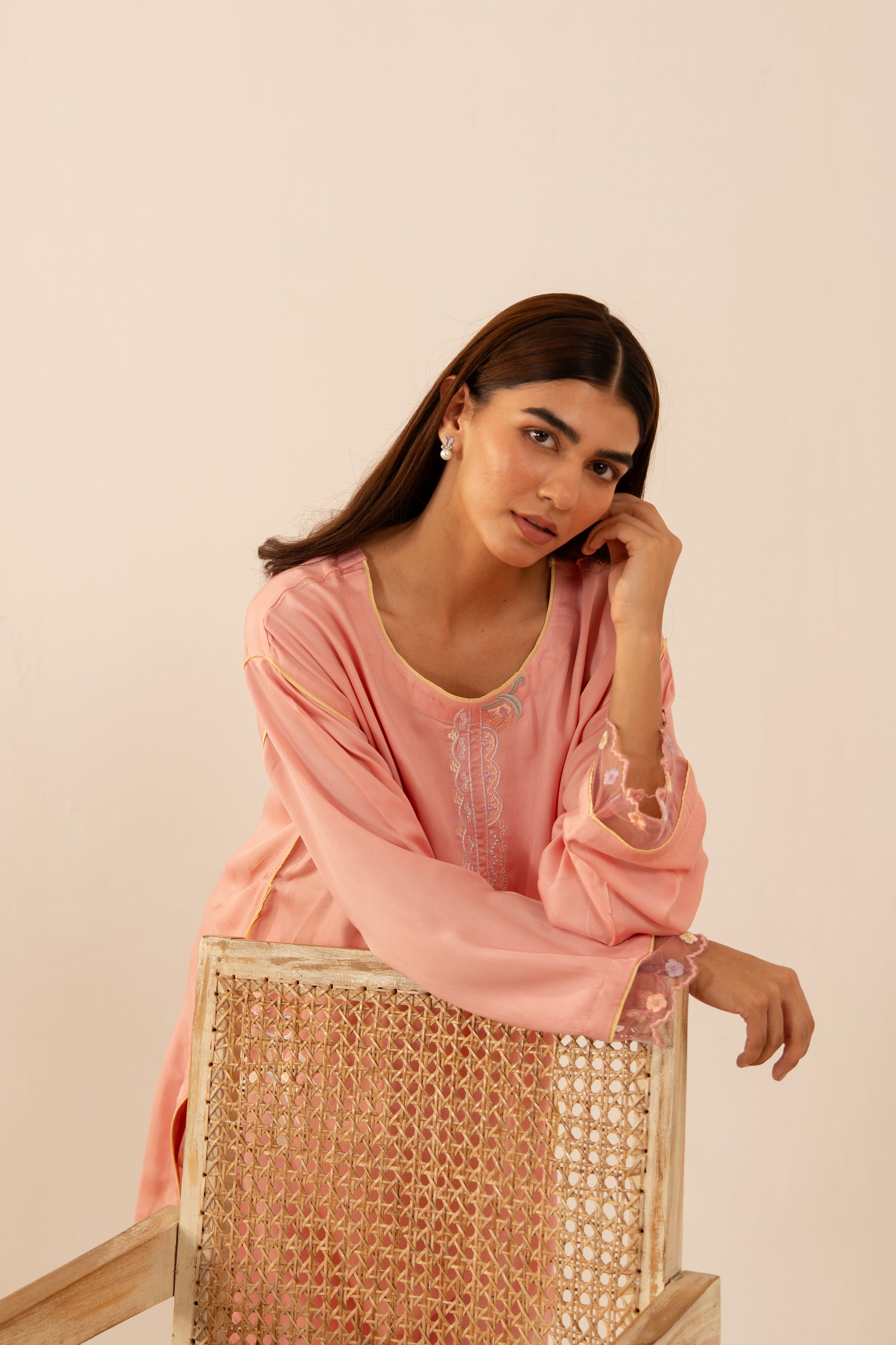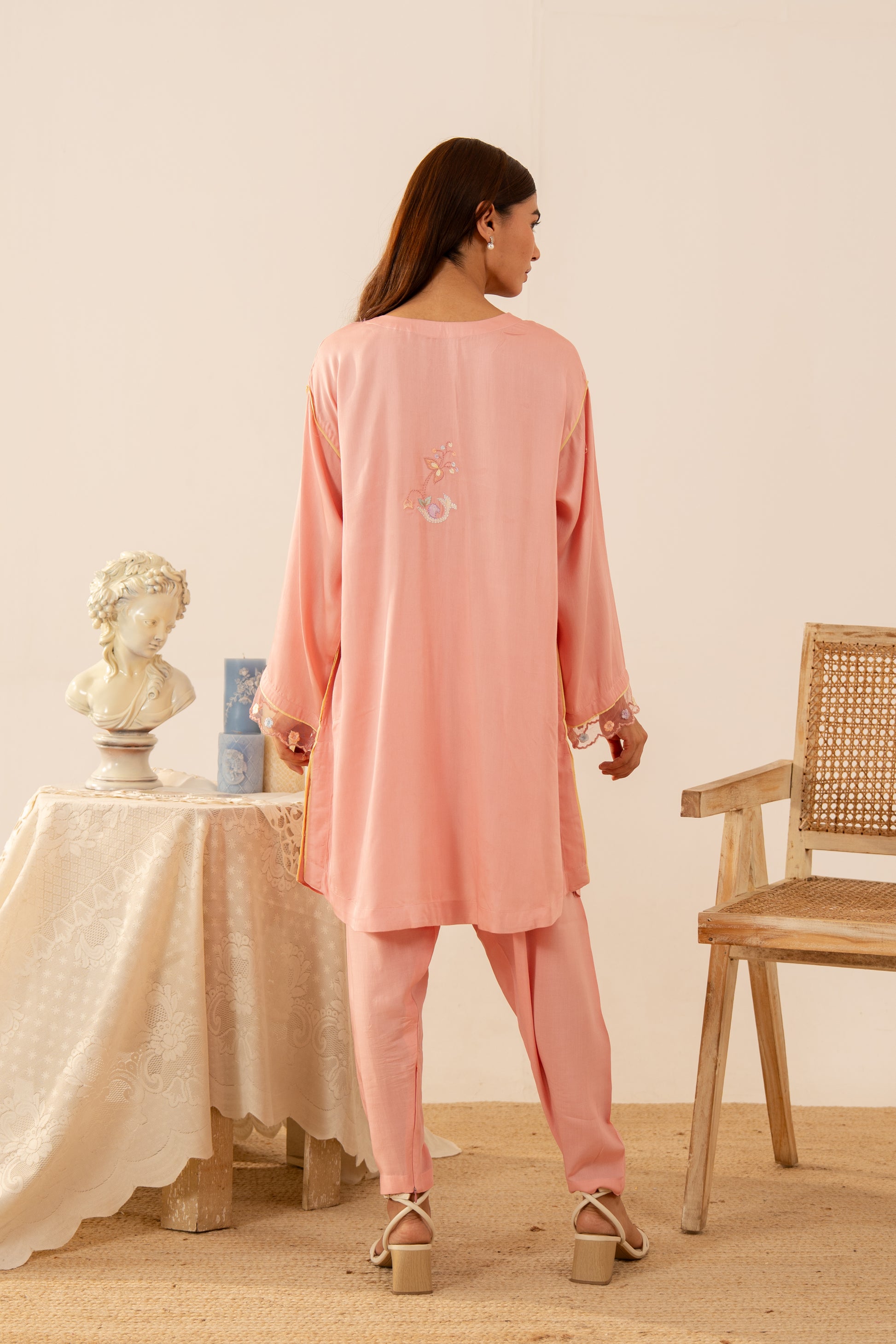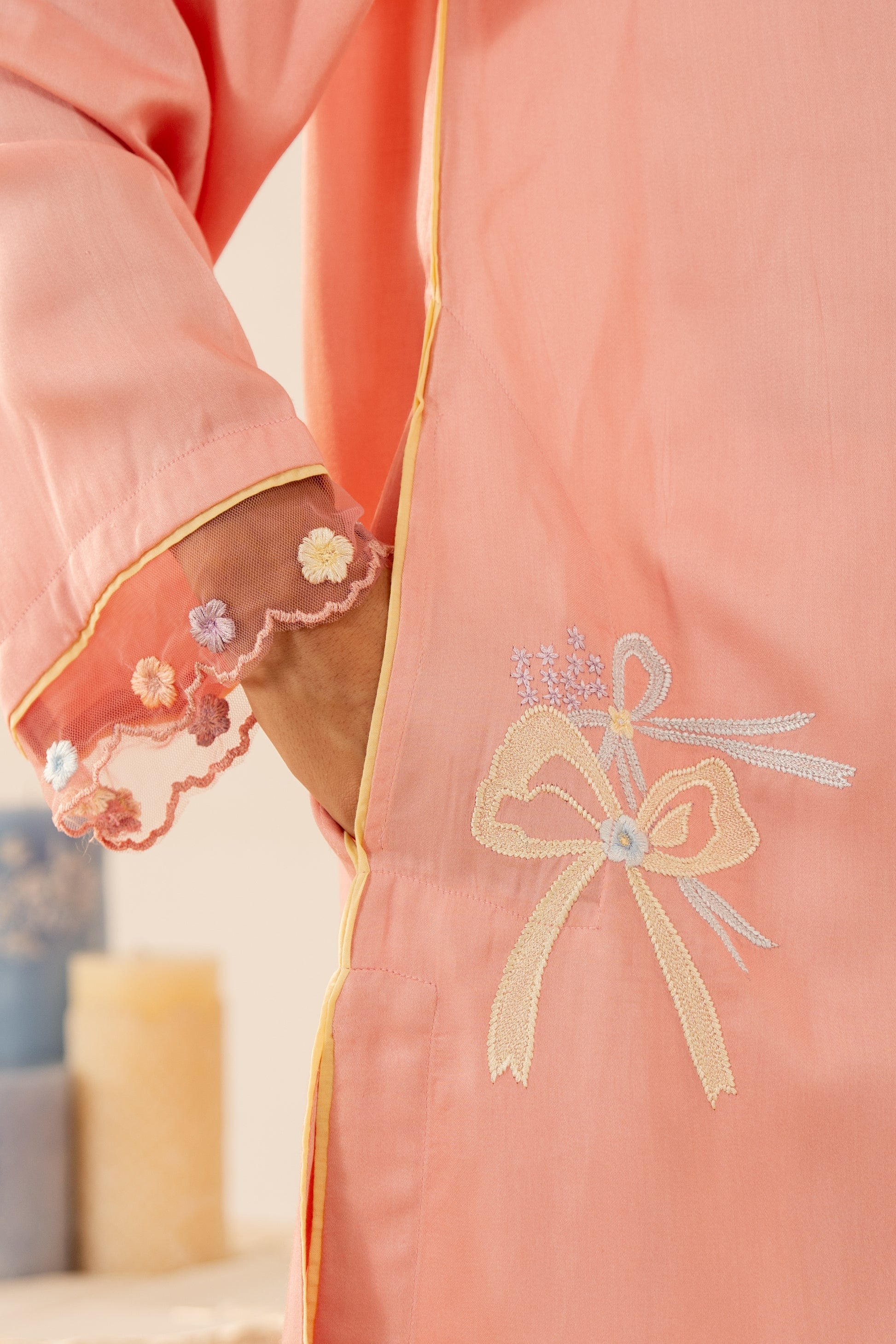 Description: A playful yet elegant bubblegum pink outfit in soft cotton satin, featuring chic vintage-inspired embroidery motifs and a delicately embroidered 3D butterfly on the neck. The loose-fit silhouette is elevated with yellow contrast piping on the sides—perfectly tailored for a summer tea party look.