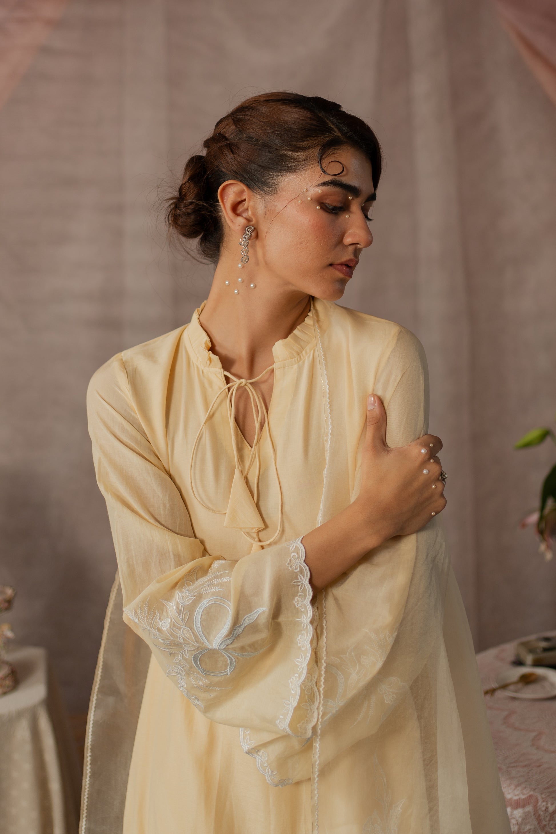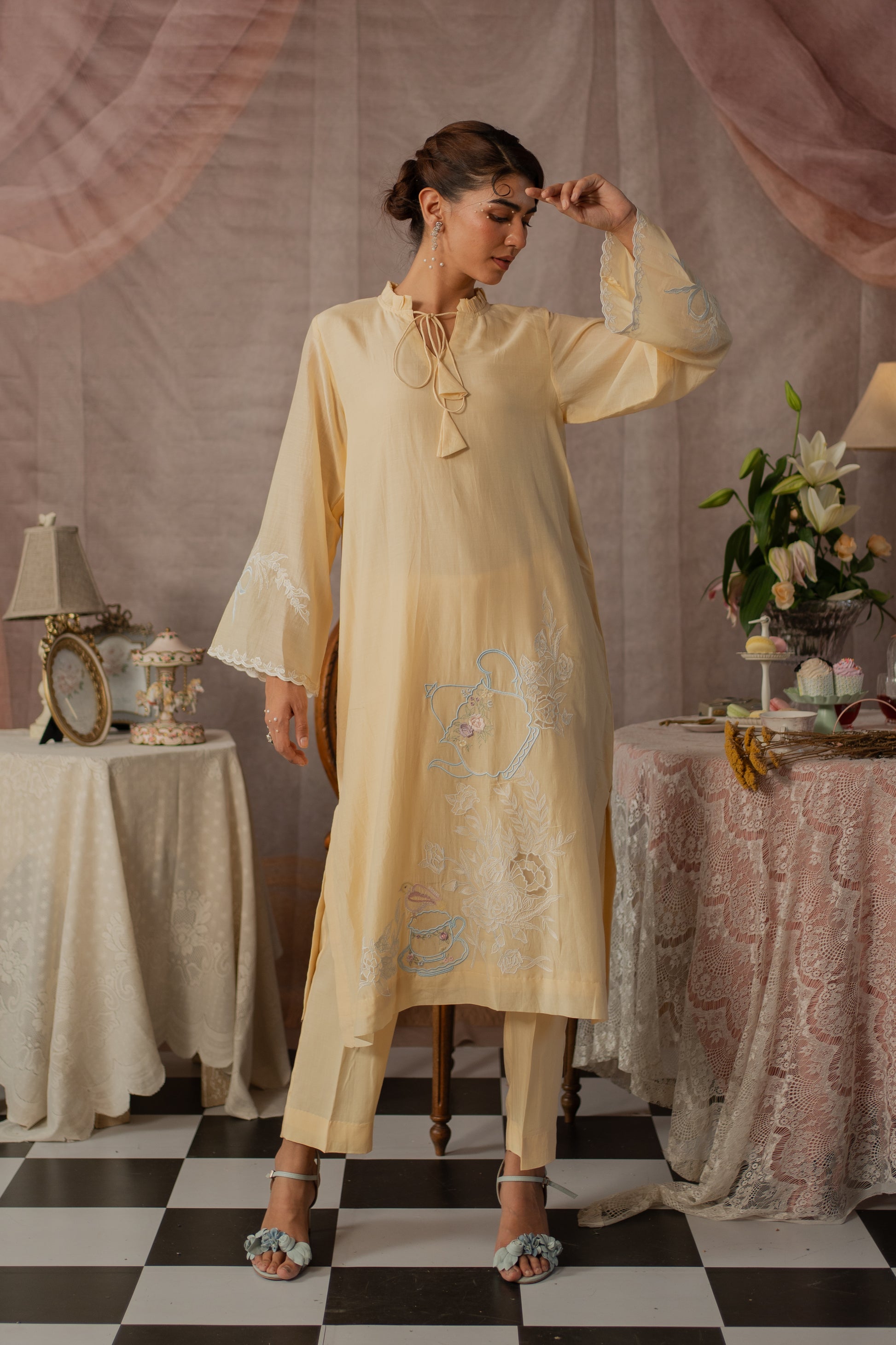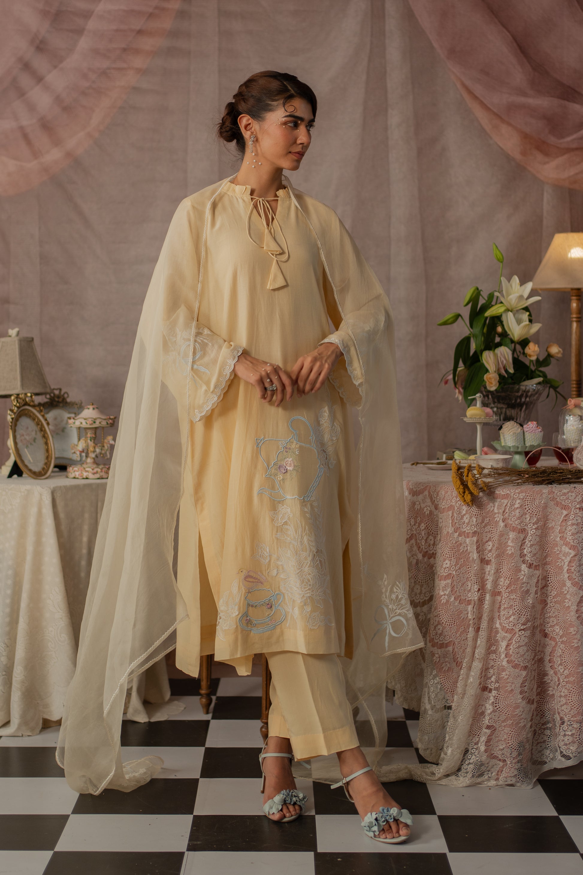 Description: A charming kurta set featuring a frill neckline with playful latkans, dainty bow embroidery on the sleeves, and tea party-inspired embroidery with a teapot and teacup motif on the shirt. Optional: pair it with an organza dupatta finished with delicate edging and embroidered bows on two corners for a sweet, graceful touch.