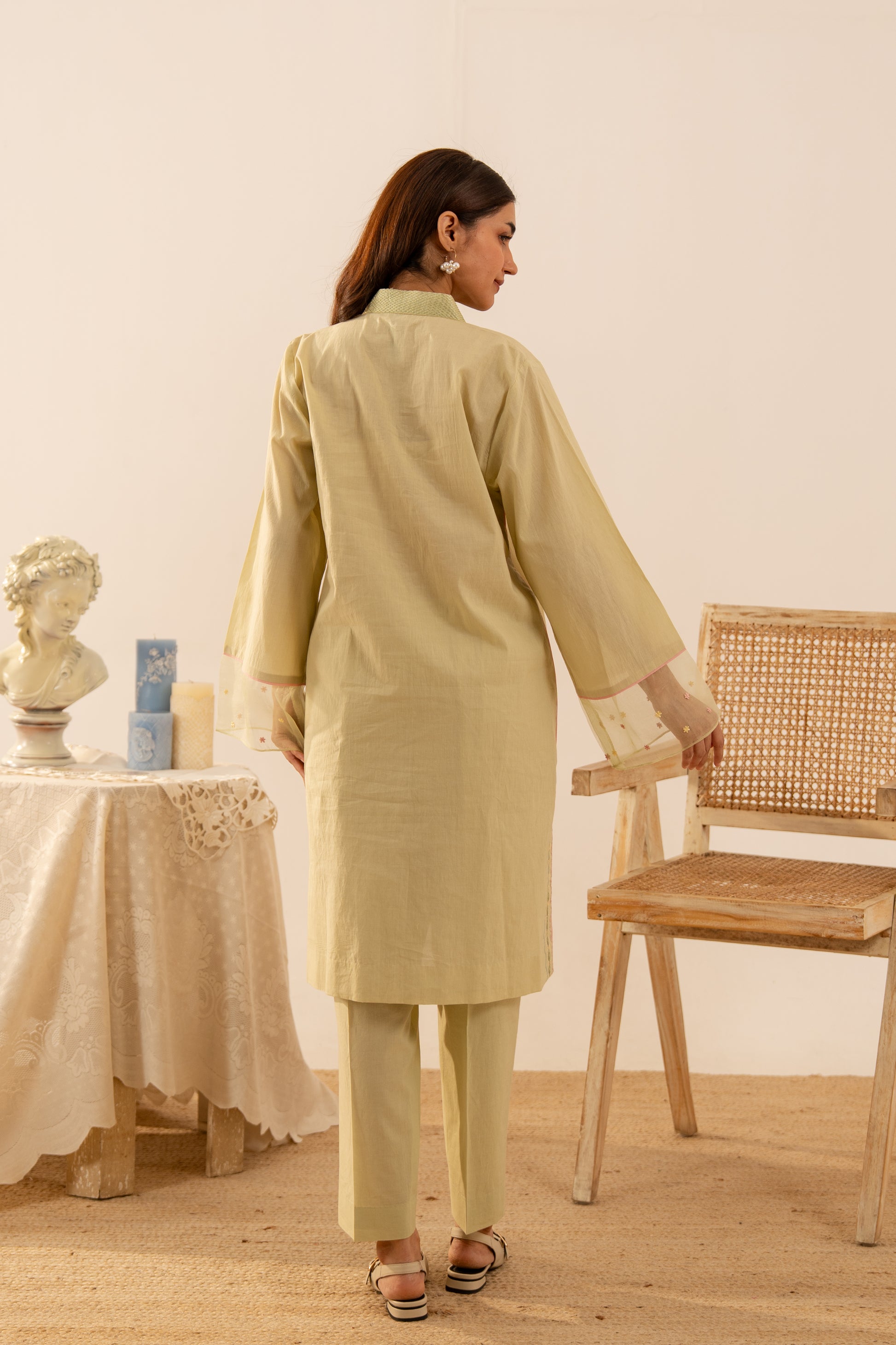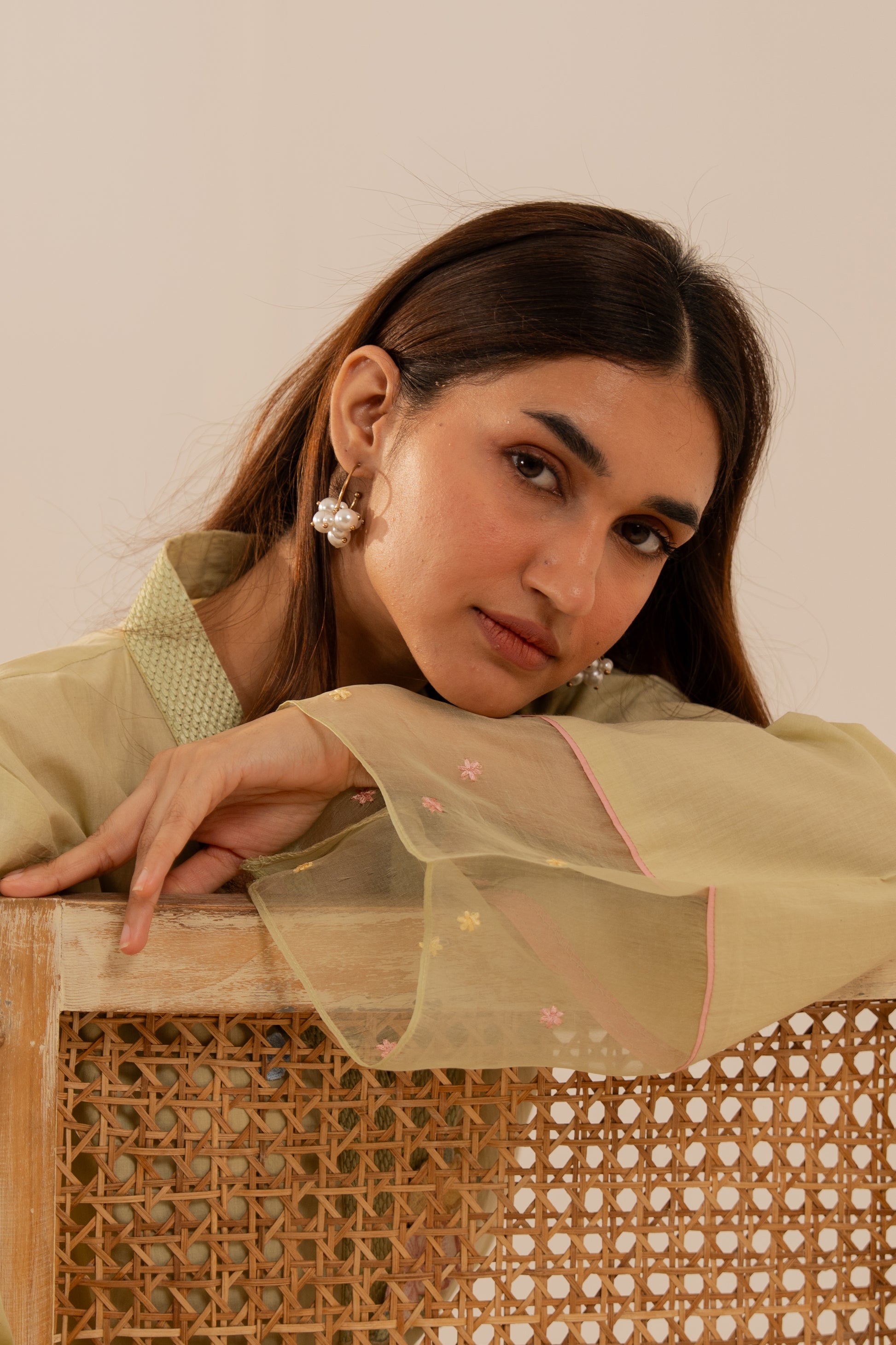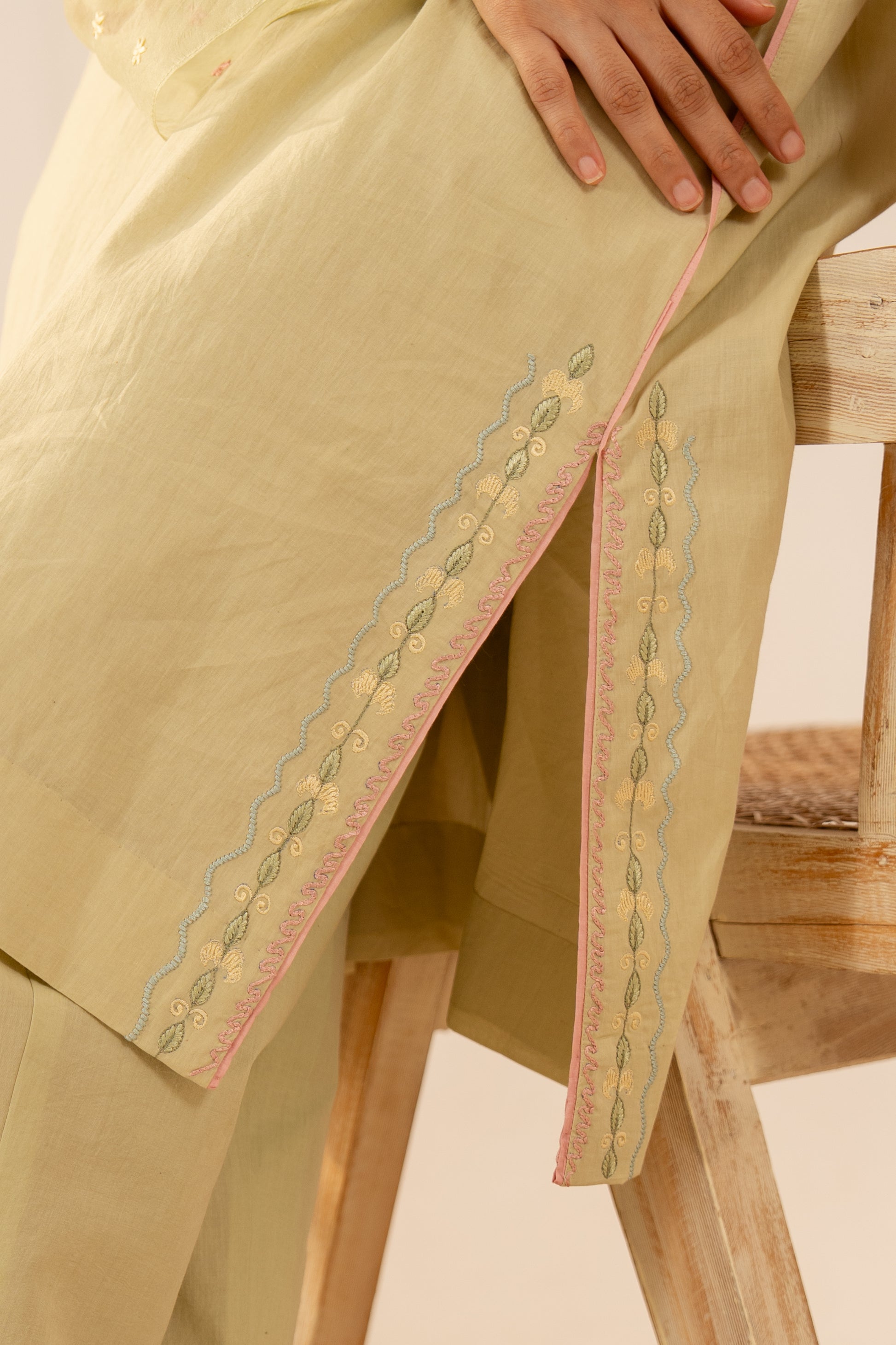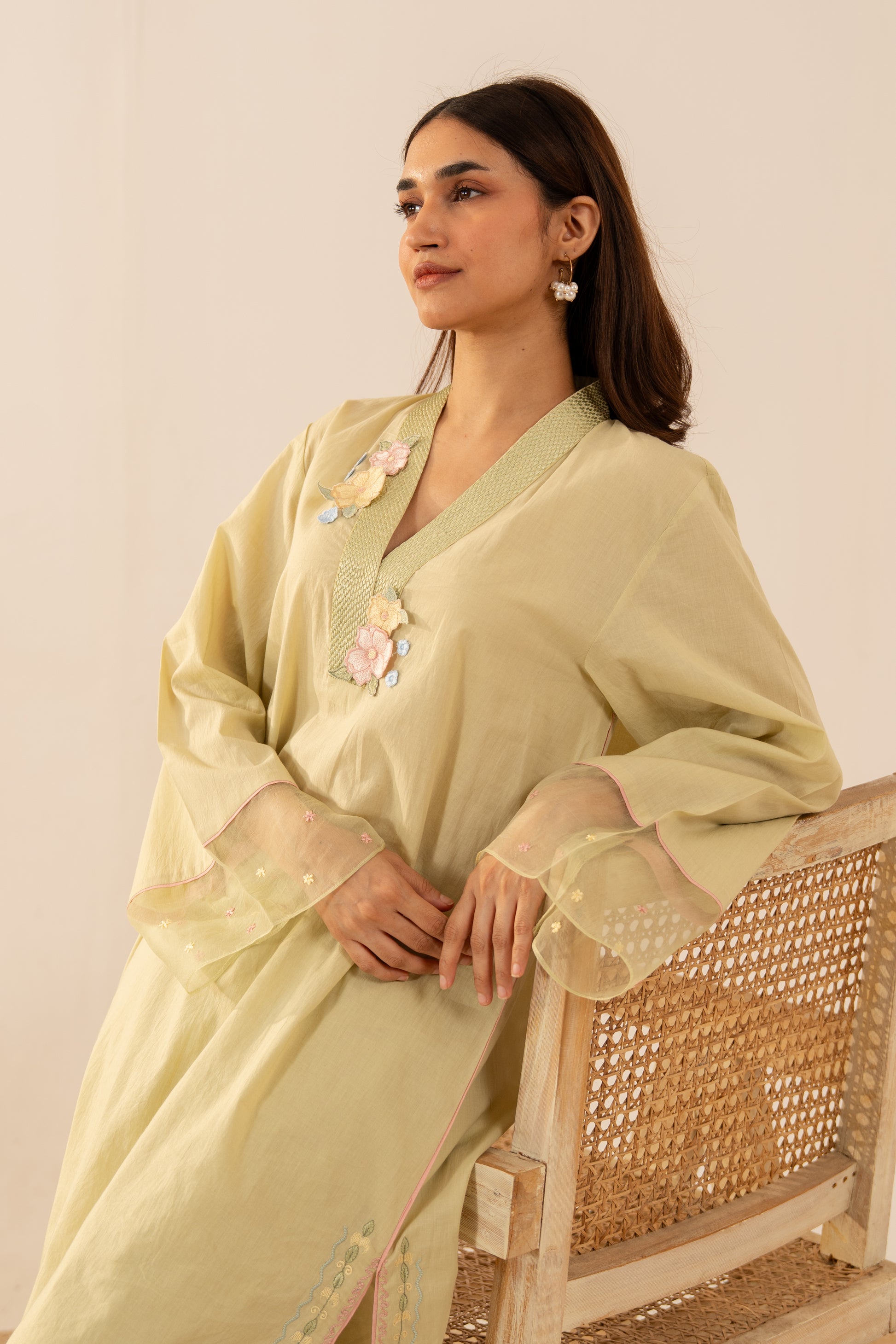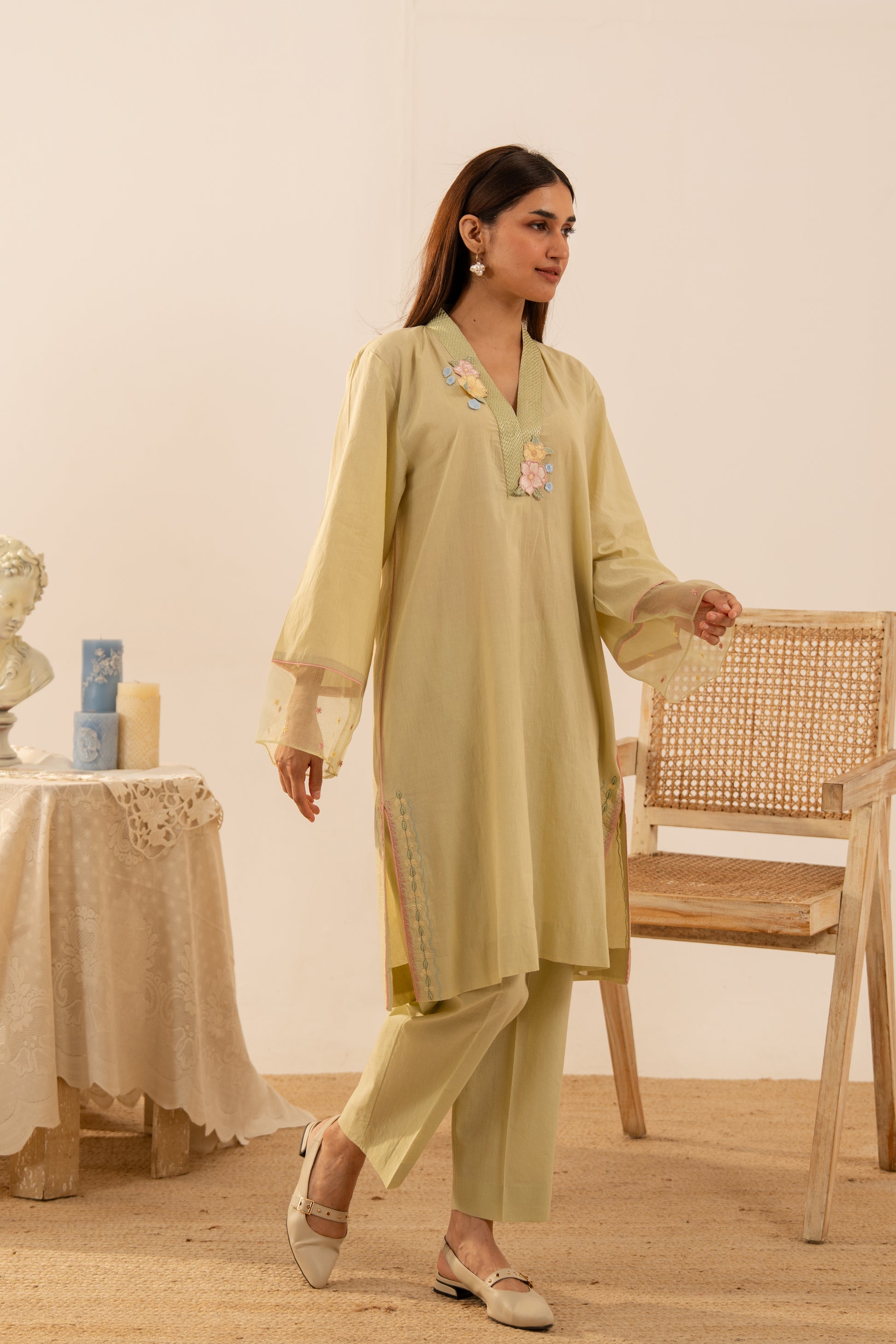 Description: Crafted from breathable green lawn cotton, this outfit features intricate neck embroidery with 3D floral accents for a striking touch. Embroidered slits add a refined finish to this elegant summer essential.