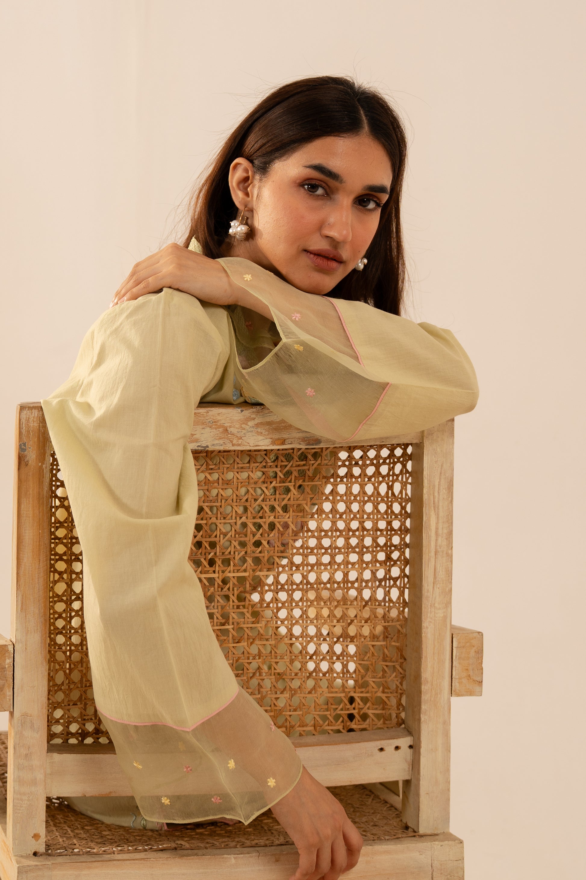 Sleeves: Wide sleeves finished with sheer organza that features delicate embroidery for a soft, feminine touch