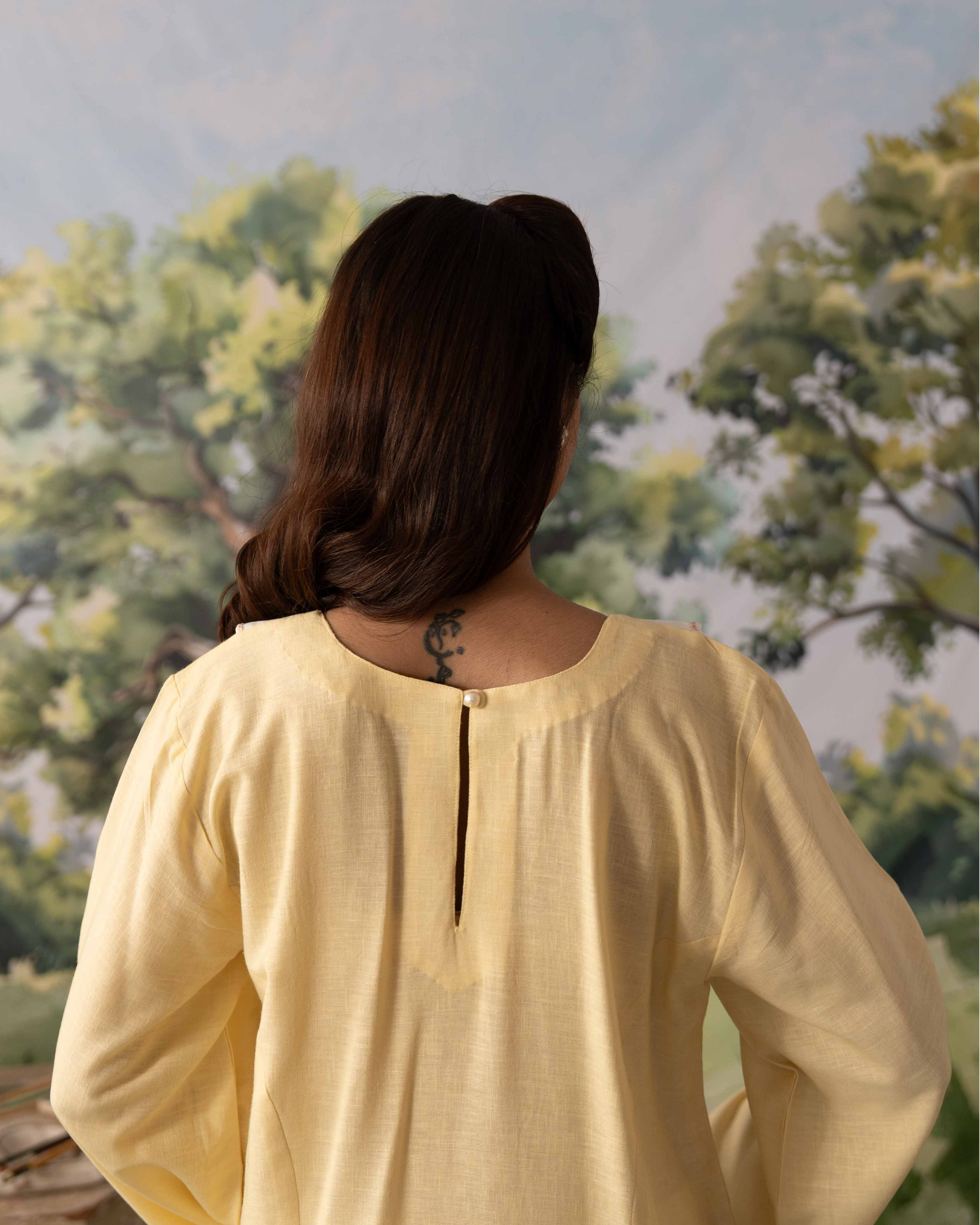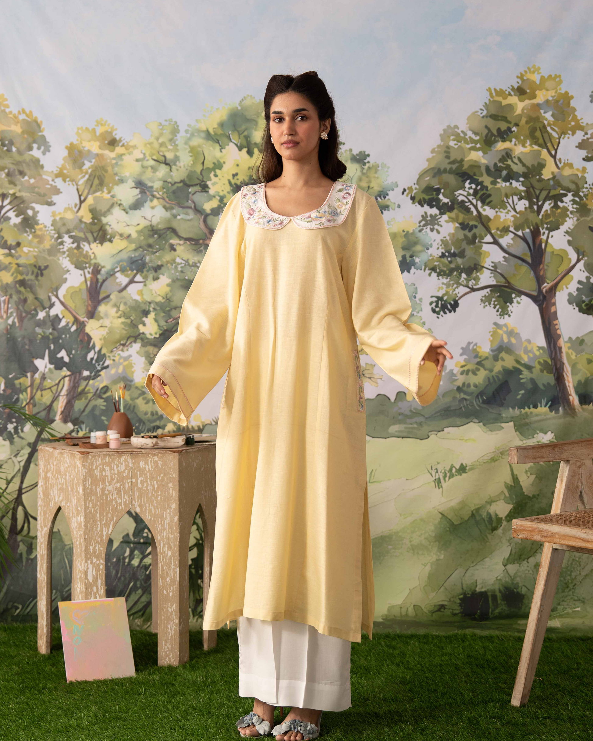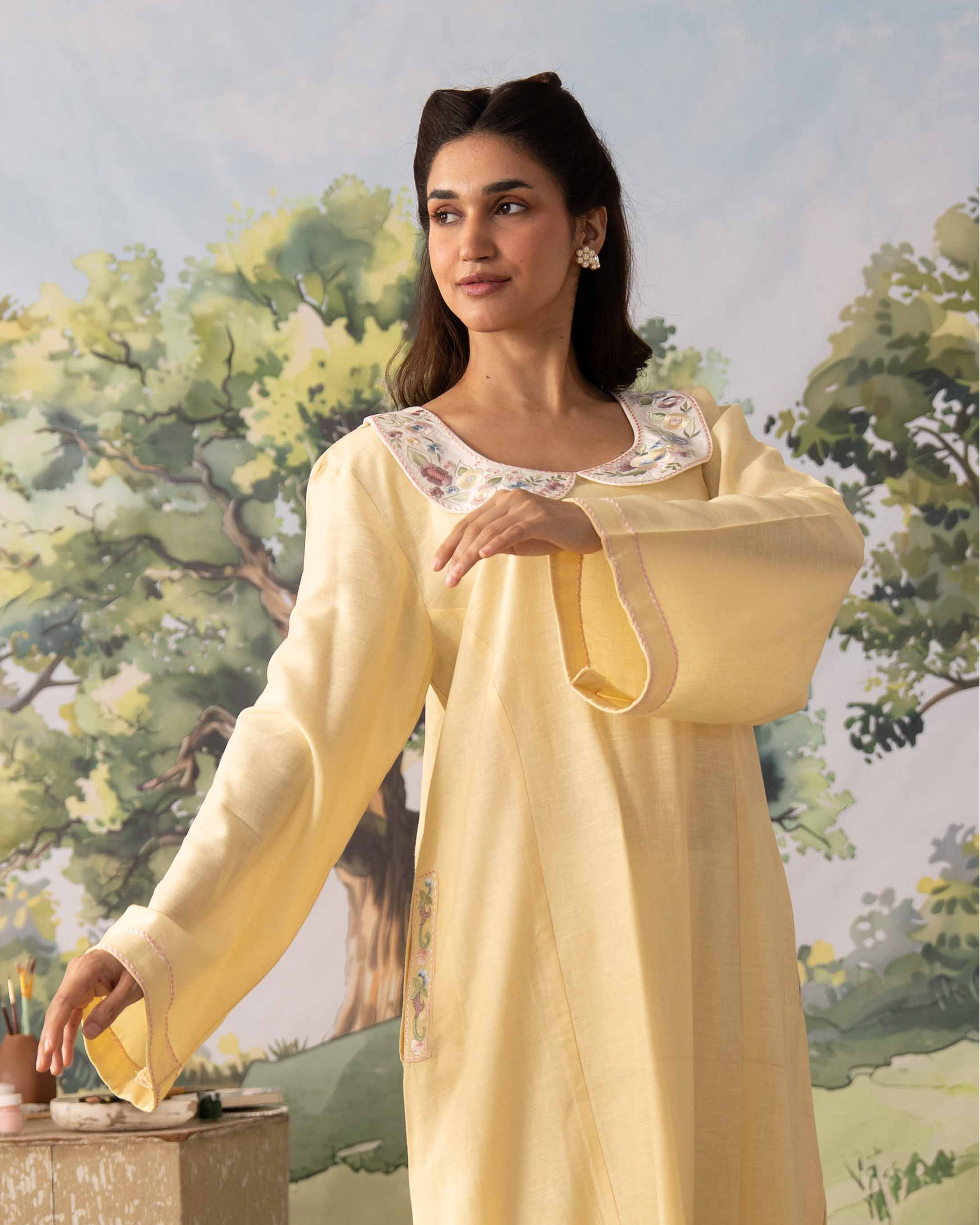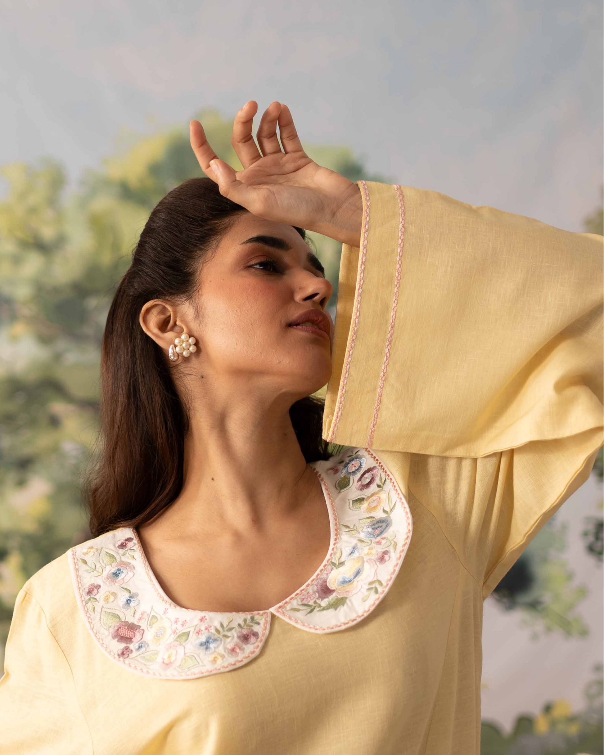 Description: A graceful linen dress featuring a charming Peter Pan collar beautifully embroidered with delicate floral motifs. Thoughtful details include discreetly embroidered pockets, blending functionality with elegance. A versatile piece that brings effortless charm to both relaxed and dressed-up occasions.