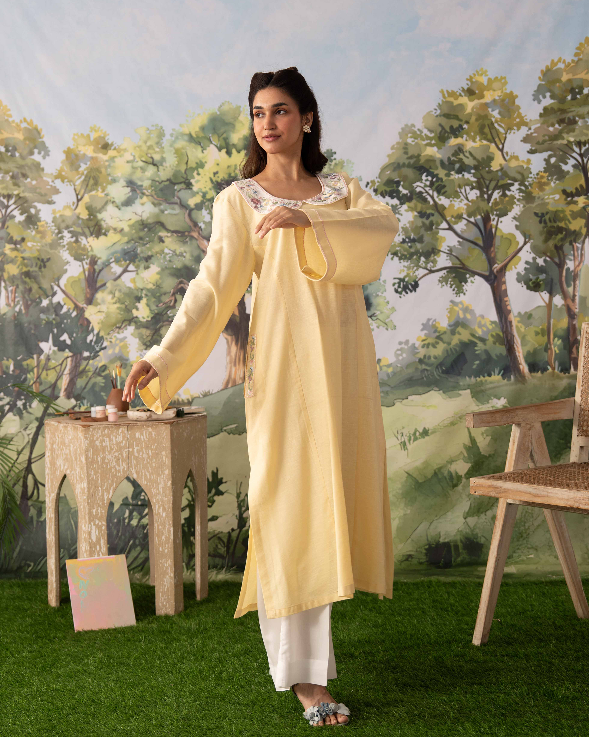 Neckline: Peter Pan collar with intricate multicolour floral embroidery